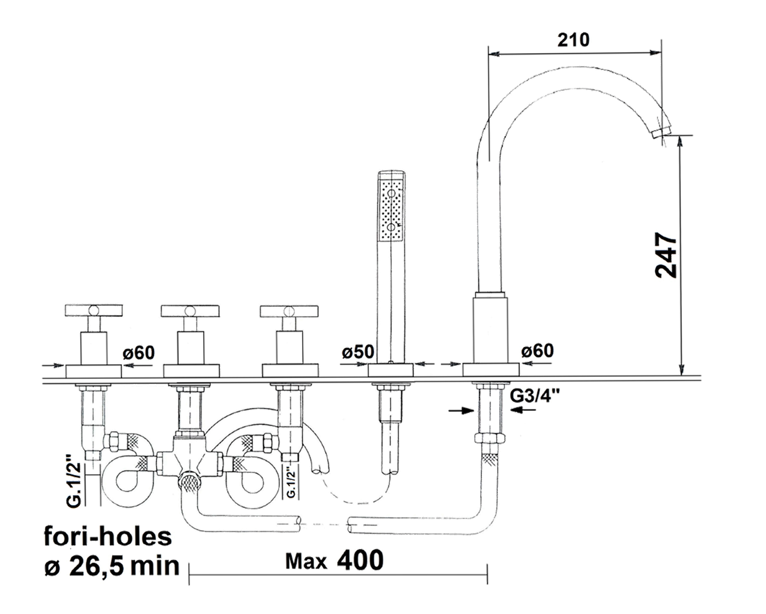 531 REITANO AXIA SELENE kádperemre szerelhető csaptelep, négy részes, zuhannyal, króm