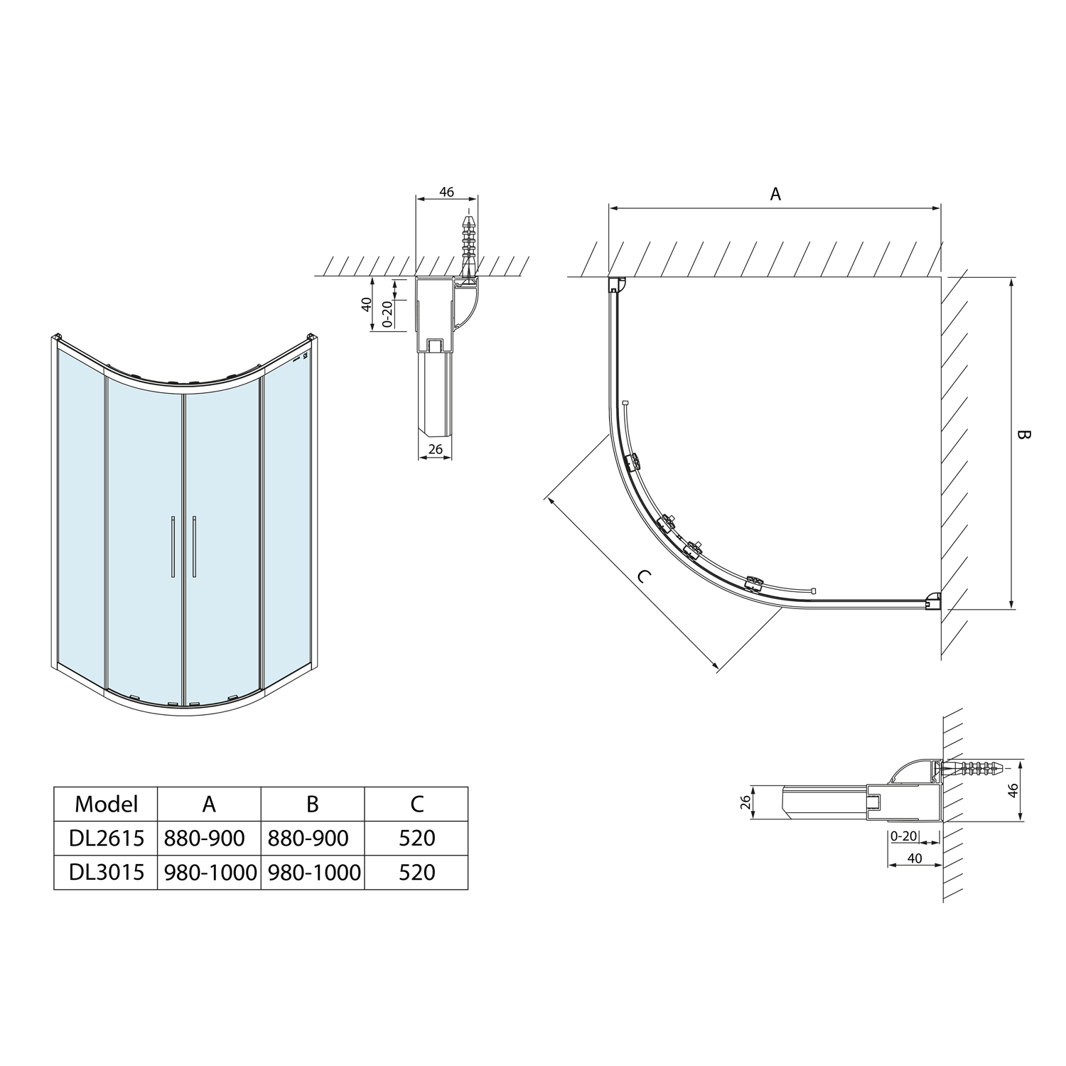 DL4215DL3415 POLYSAN LUCIS LINE 4 részes tolóajtó és oldalfal, 1500x900mm