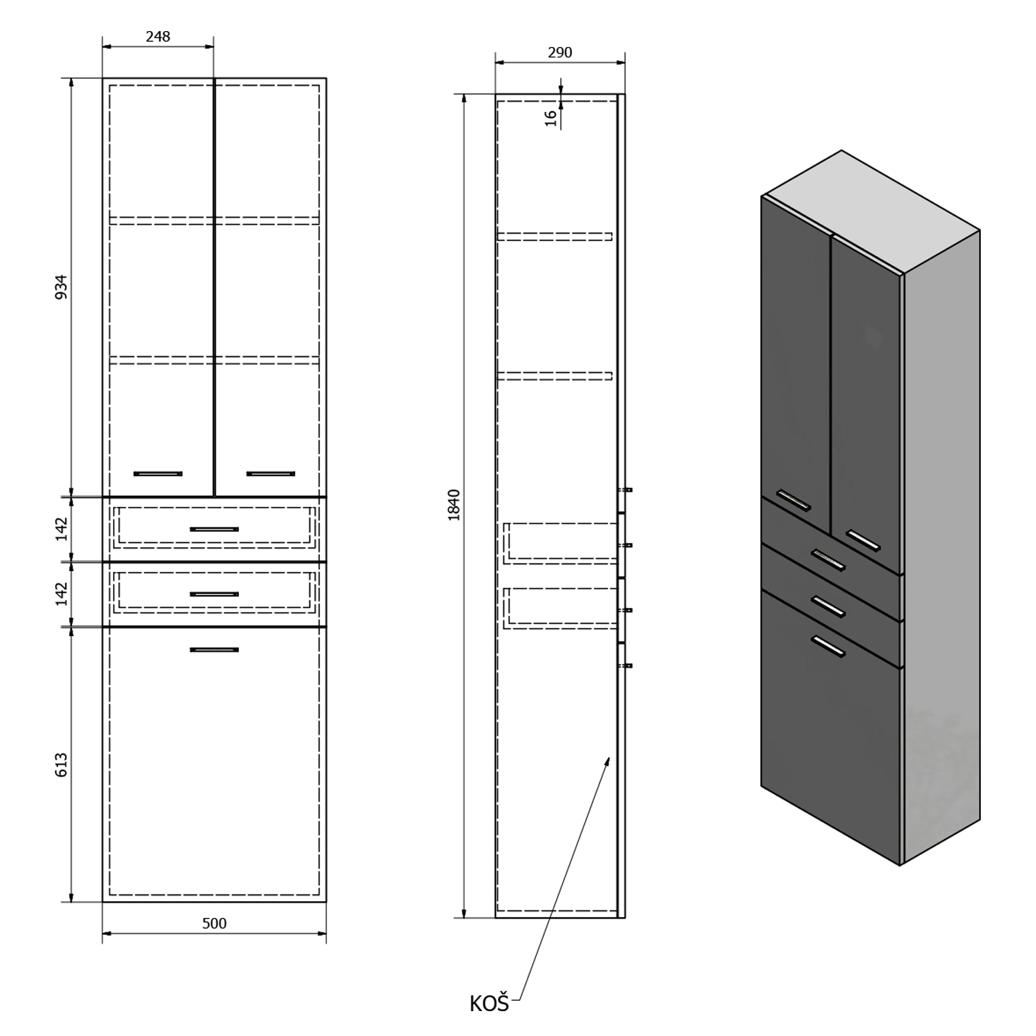 AQUALINE ZOJA állószekrény fiókkal, szennyeskosárral, 50x184x2cm, fehér (51293)