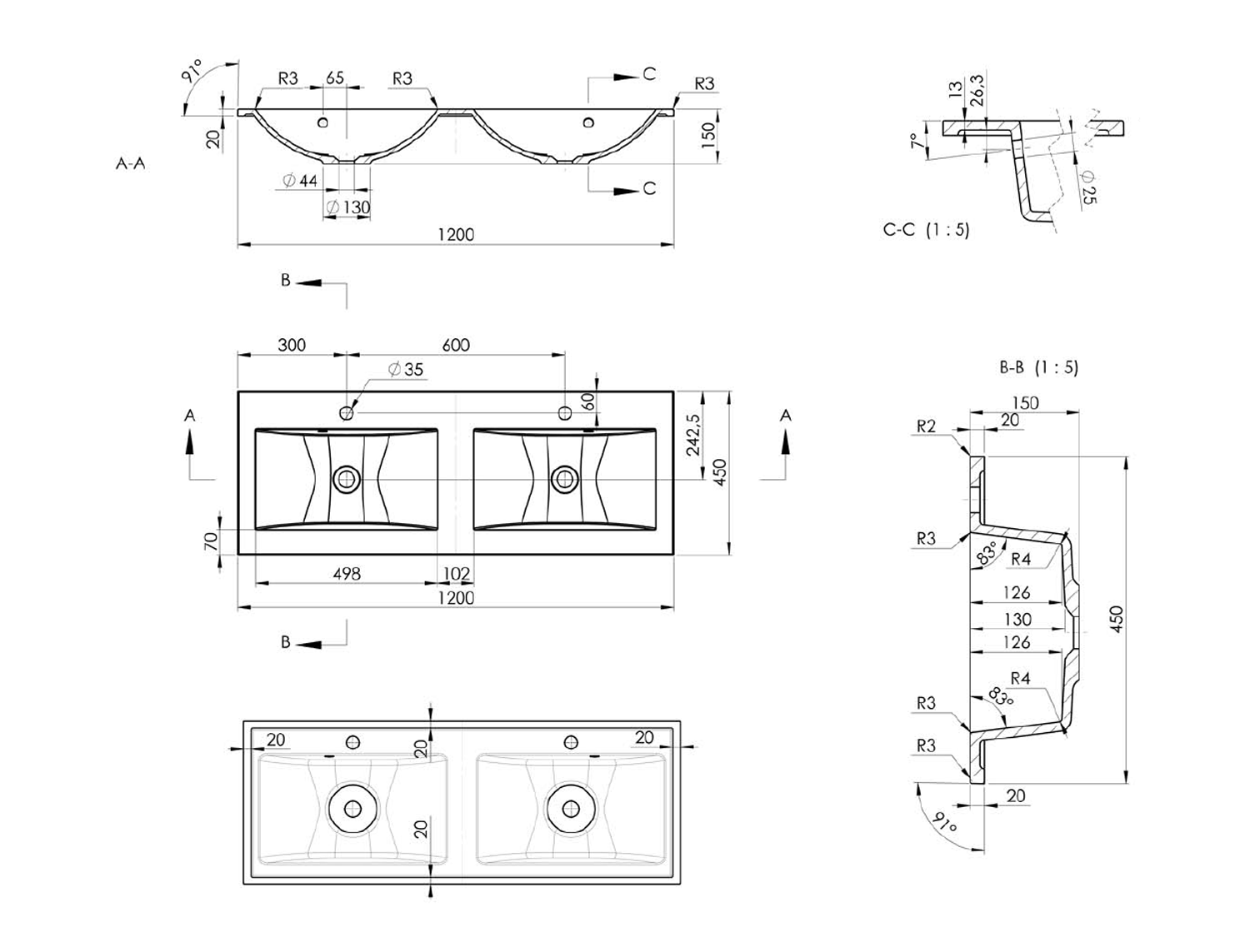 YU122 YUKON öntöttmárvány mosdó, 2 furattal, 120x45cm