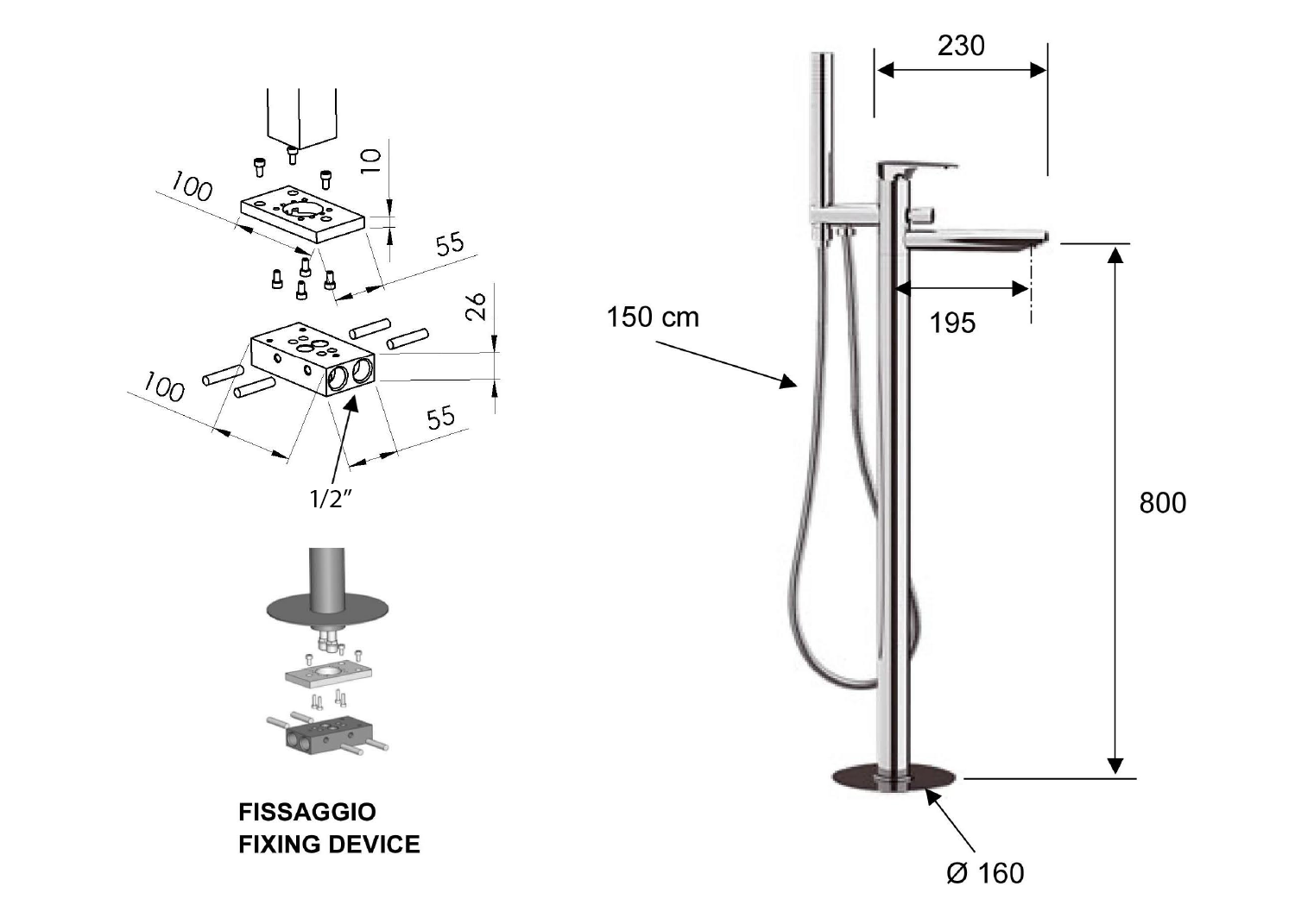 CE21 CORNELI térben álló kádtöltő csaptelep, zuhanyszettel, alaptesttel, króm