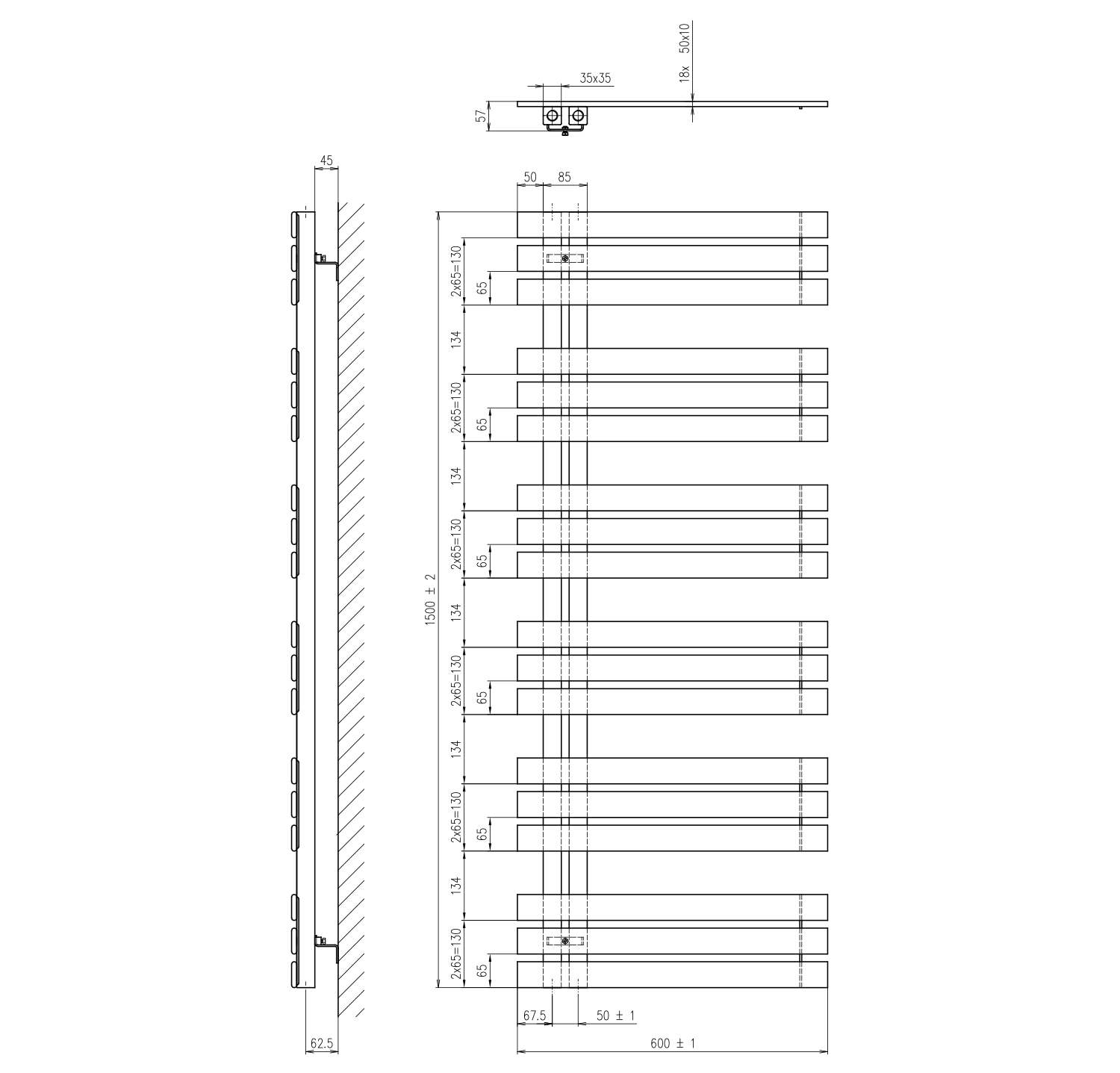 Towel rail with a 50 mm connection spacing