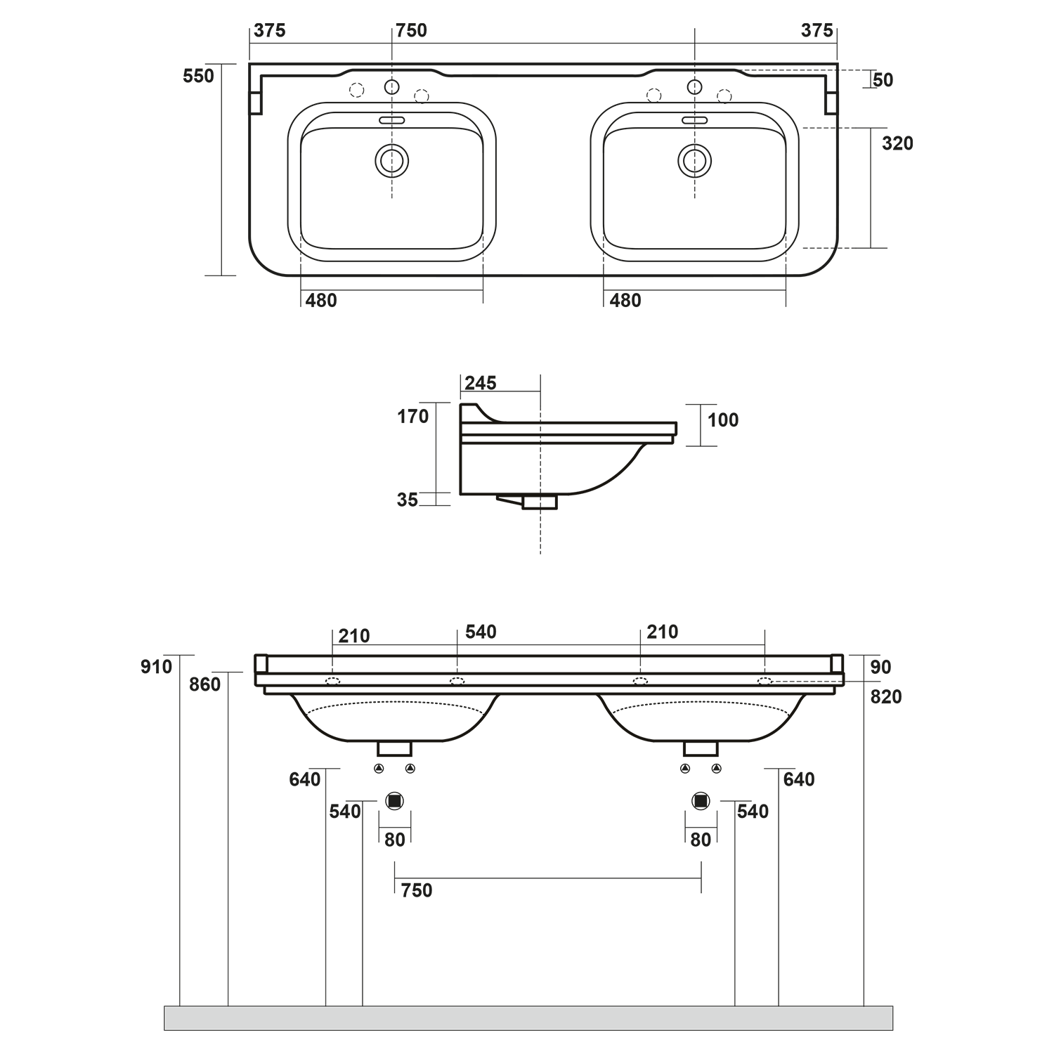 4143K1-3 KERASAN WALDORF dupla kerámiamosdó, 6 furattal, 150x55cm