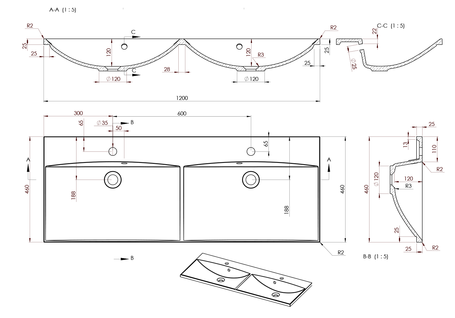MA120 MARIA öntöttmárvány duplamosdó 120x46cm