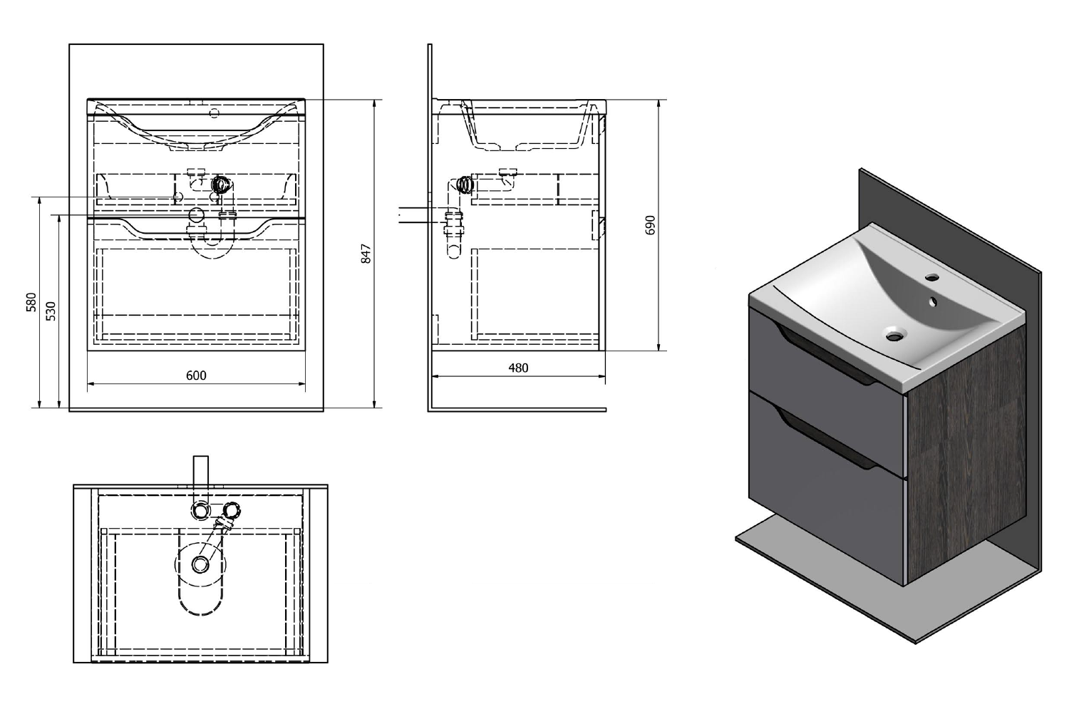 WA060-3021 WAVE II mosdótartó szekrény, 2 fiókkal, 60x65x48cm, fehér/maliwenge