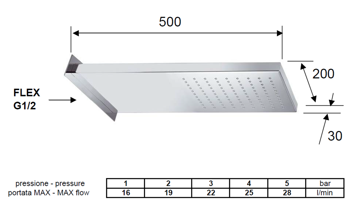 Fali fejzuhany, téglalap, 500x200x30mm, polírozott inox (DP562)