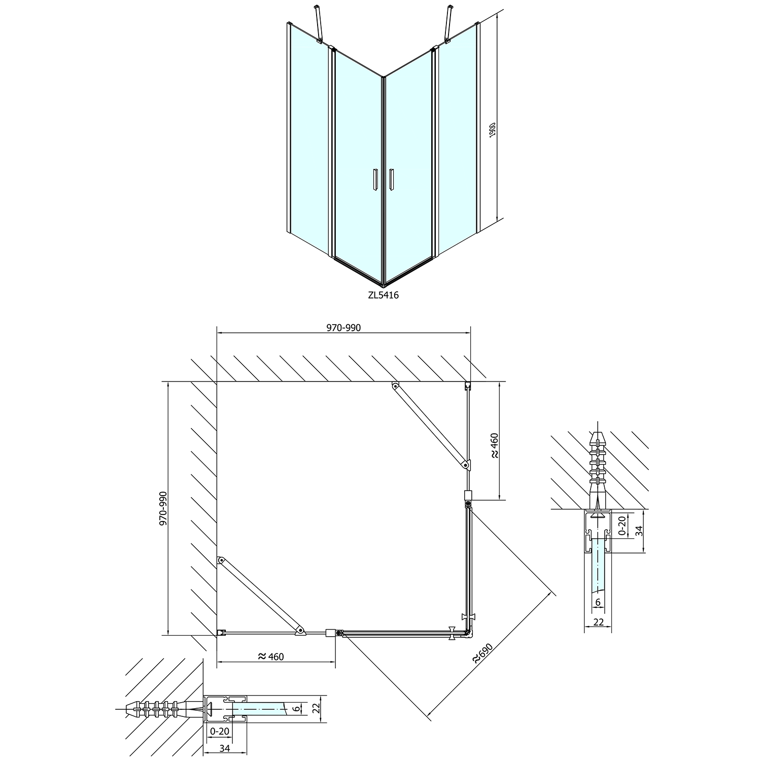 ZL1210ZL3210 POLYSAN ZOOM LINE zuhanyajtó és oldalfal, jobbos/balos, 1000x1000mm, transzparent, króm