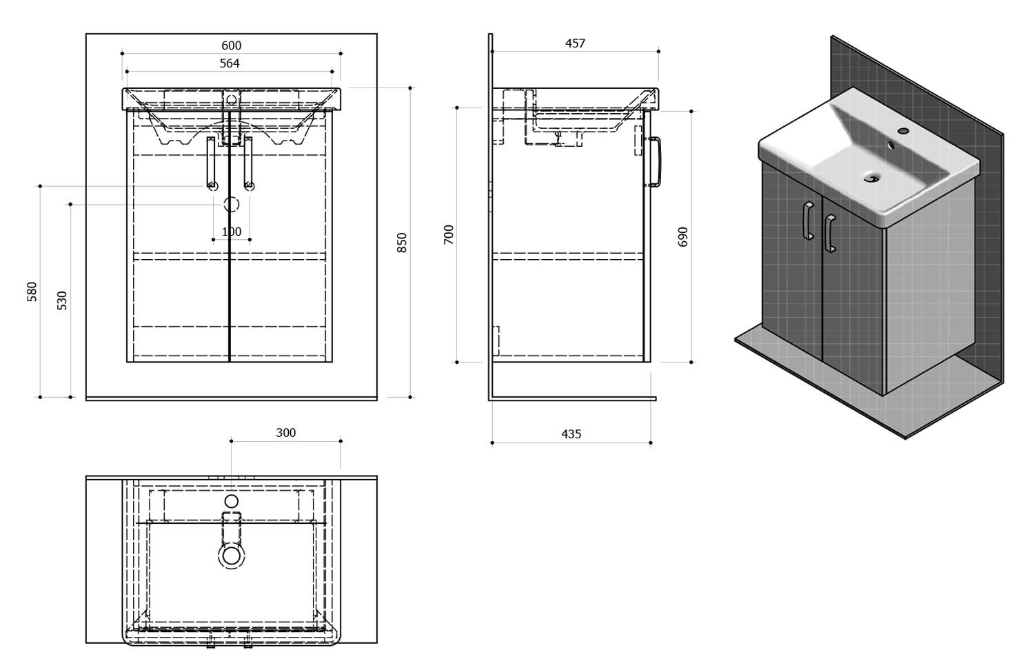 TH060-3030-01 THEIA mosdótartó szekrény THALIE mosdóval, 56,4x70x43,5cm, fehér