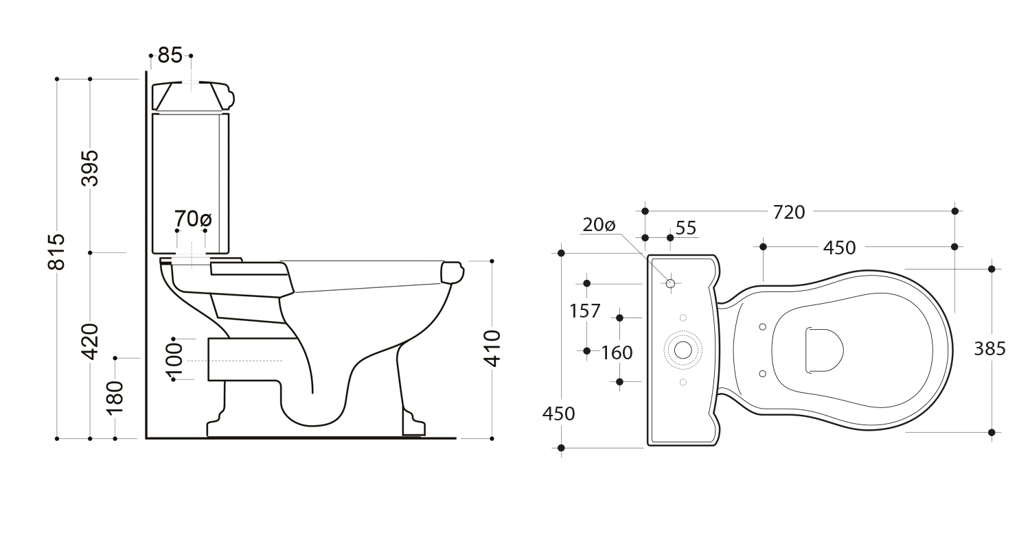 WCSET02-RETRO-ZO KERASAN RETRO álló WC, hátsó kifolyású, tartállyal, öblítőmechanikával, ülőke nélkül