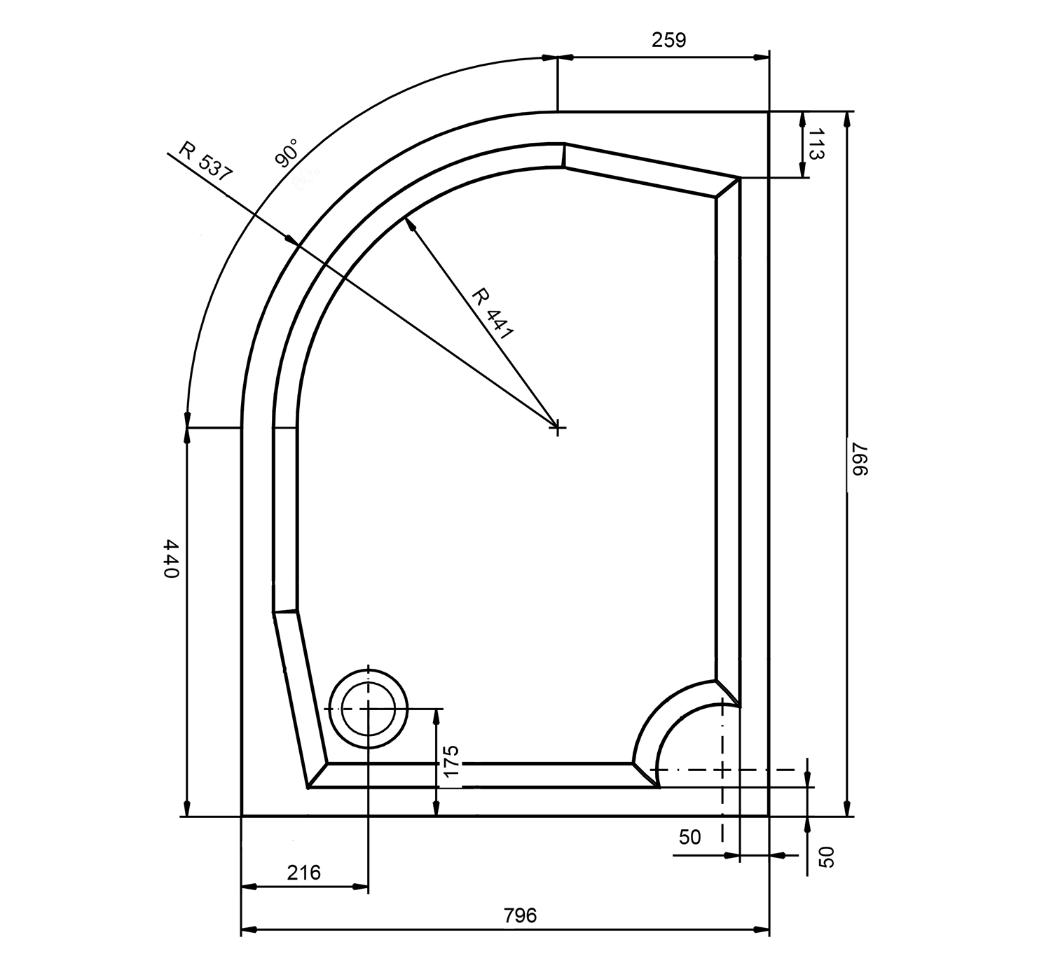 91251 POLYSAN FLEXIA öntöttmárvány íves zuhanytálca, méretre vágható, jobbos, 100x80x3cm, R550