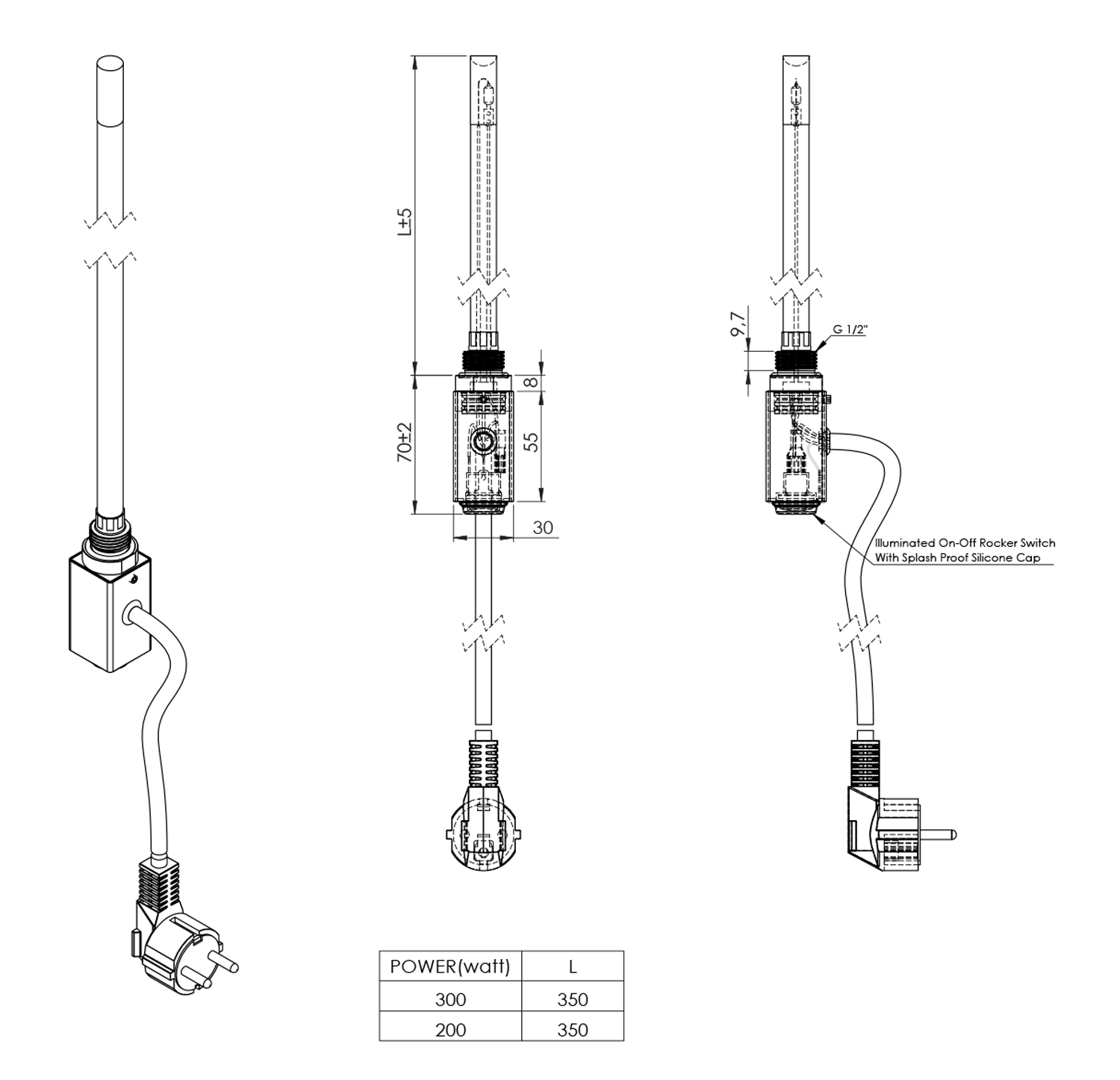 KTX-C-300 KTX Elektromos termosztátos fűtőpatron, 300W, króm