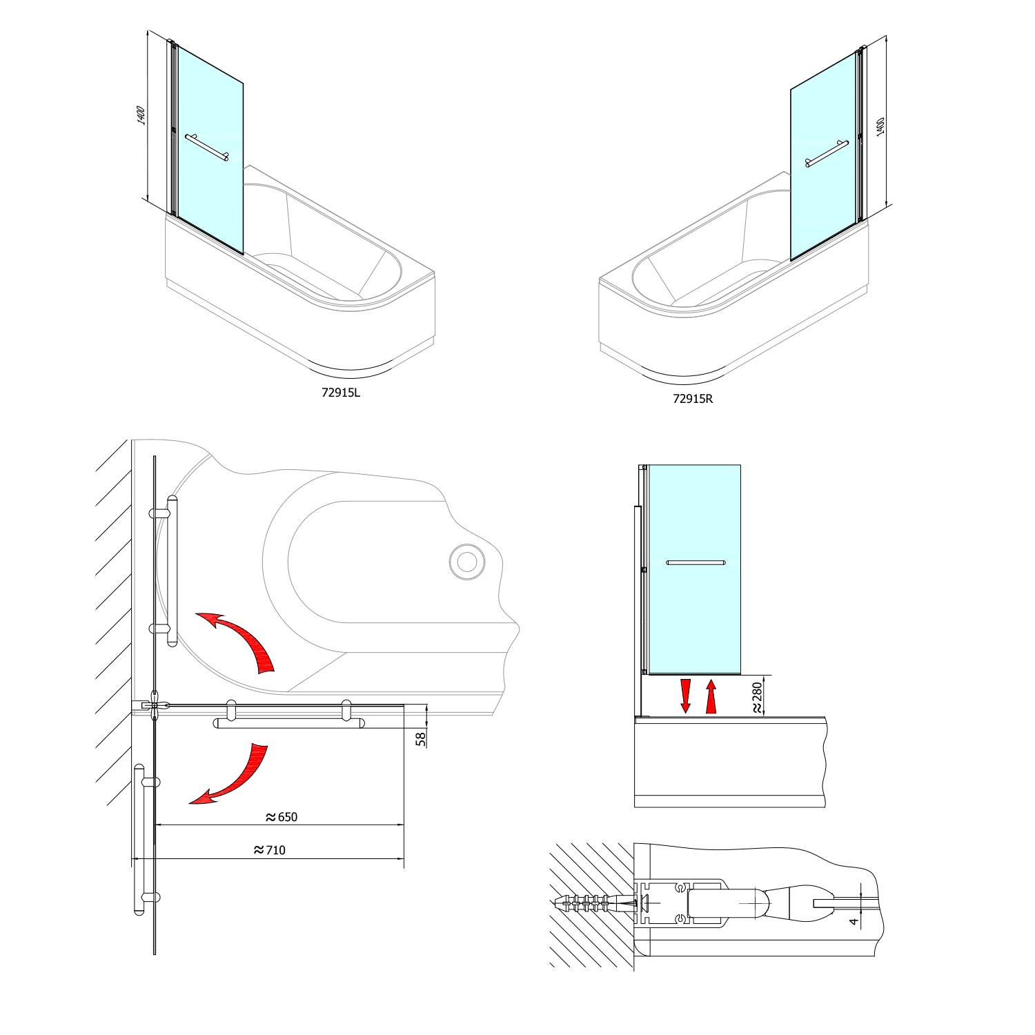 Integrated pneumatic pistons allow the screen to be raised by 28cm and tilted to the wall, e.g. over the bathtub mixer. This solution offers easy maintenance and access in the bathtub. Thanks to the pressure piston, protection against splashing water is ensured.