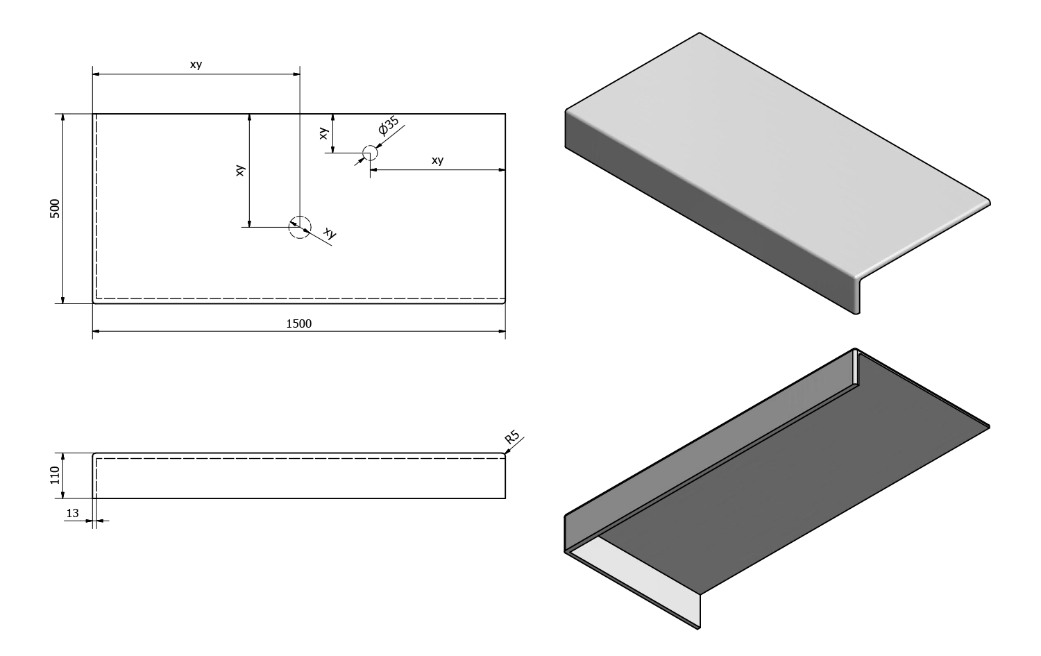 • Can be supplied with tap and waste holes according to drawing (can also be drilled at the installation site)