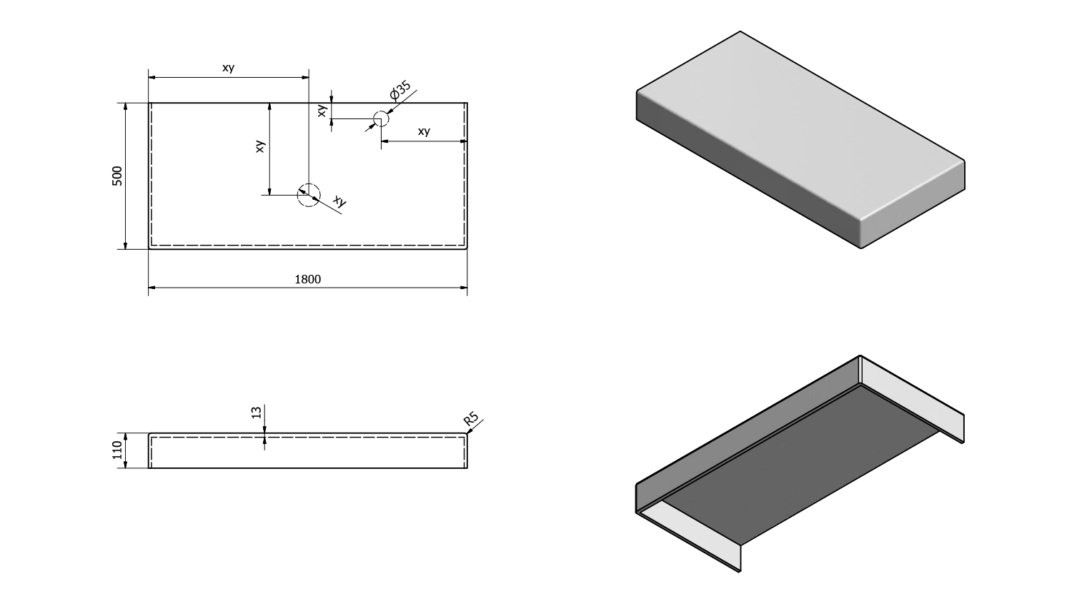 • Can be supplied with tap and waste holes according to drawing (can also be drilled at the installation site)