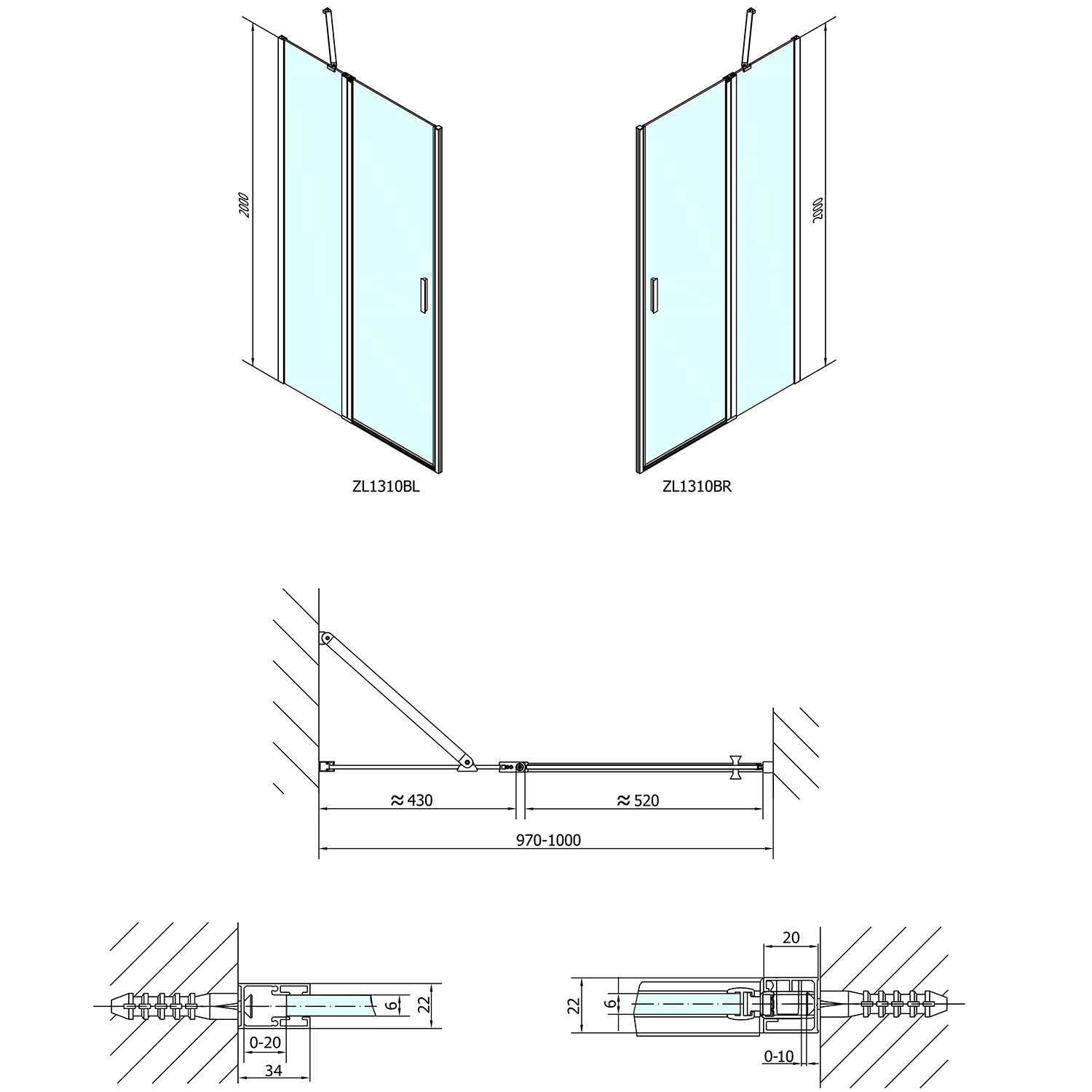 ZL1310BZL3280B POLYSAN ZOOM LINE zuhanyajtó és oldalfal, jobbos/balos, 1000x800mm, transzparent, fekete