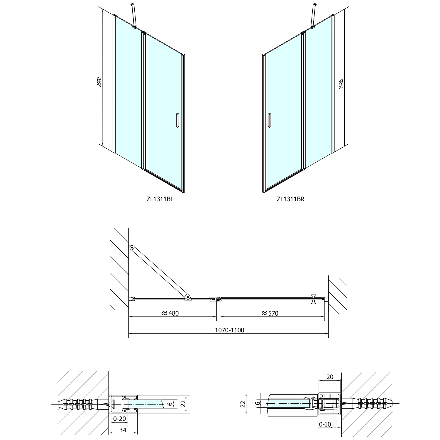 ZL1311BZL3210B POLYSAN ZOOM LINE zuhanyajtó és oldalfal, jobbos/balos, 1100x1000mm, transzparent, fekete