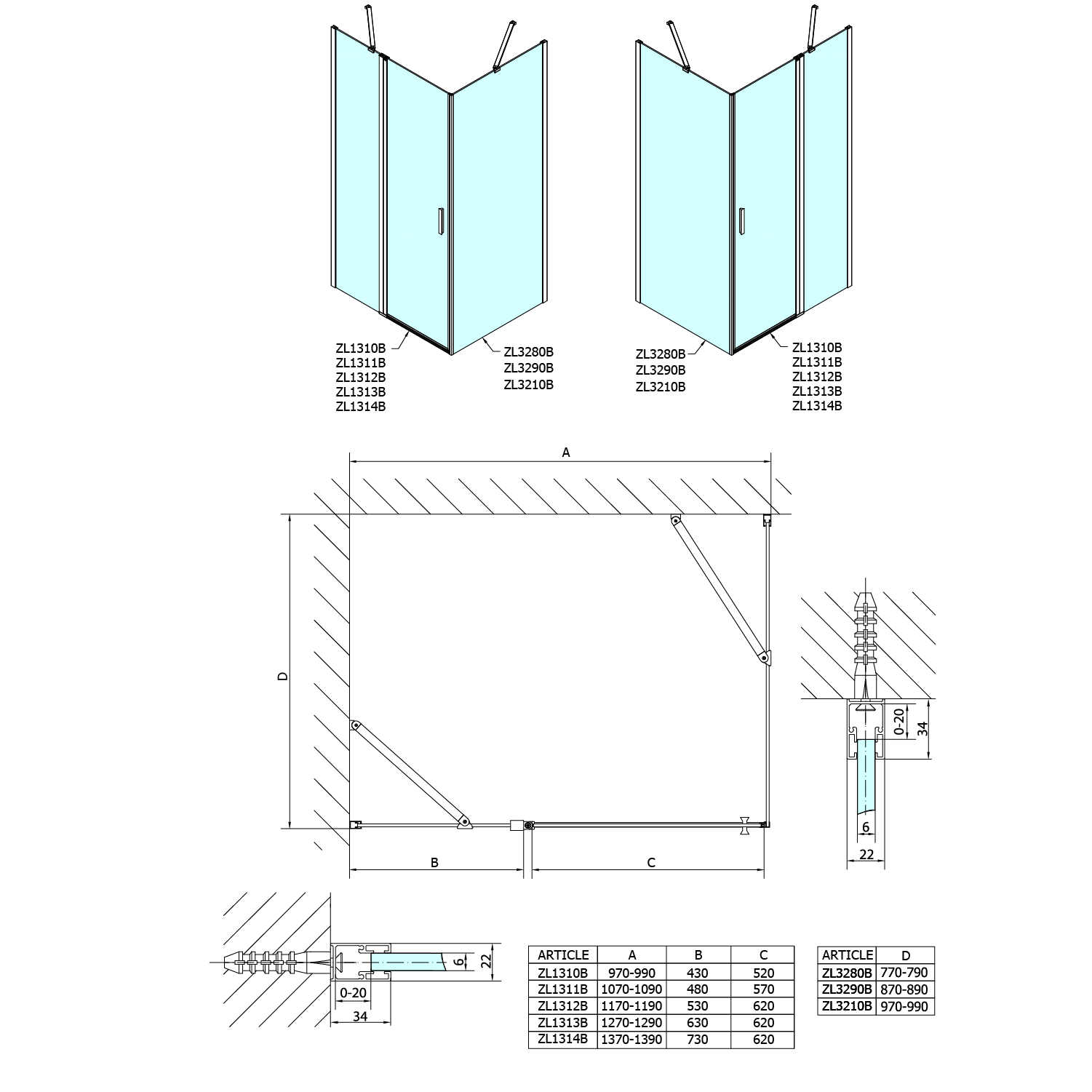 ZL1310BZL3210B POLYSAN ZOOM LINE zuhanyajtó és oldalfal, jobbos/balos, 1000x1000mm, transzparent, fekete