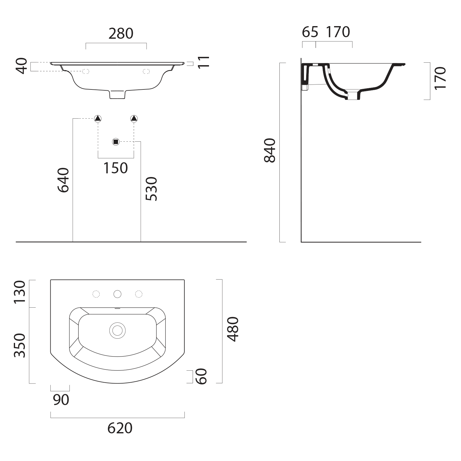 88279311 GSI PURA SLIM kerámiamosdó, 62x48cm, csiszolt alsó élekkel, 3 furattal, ExtraGlaze