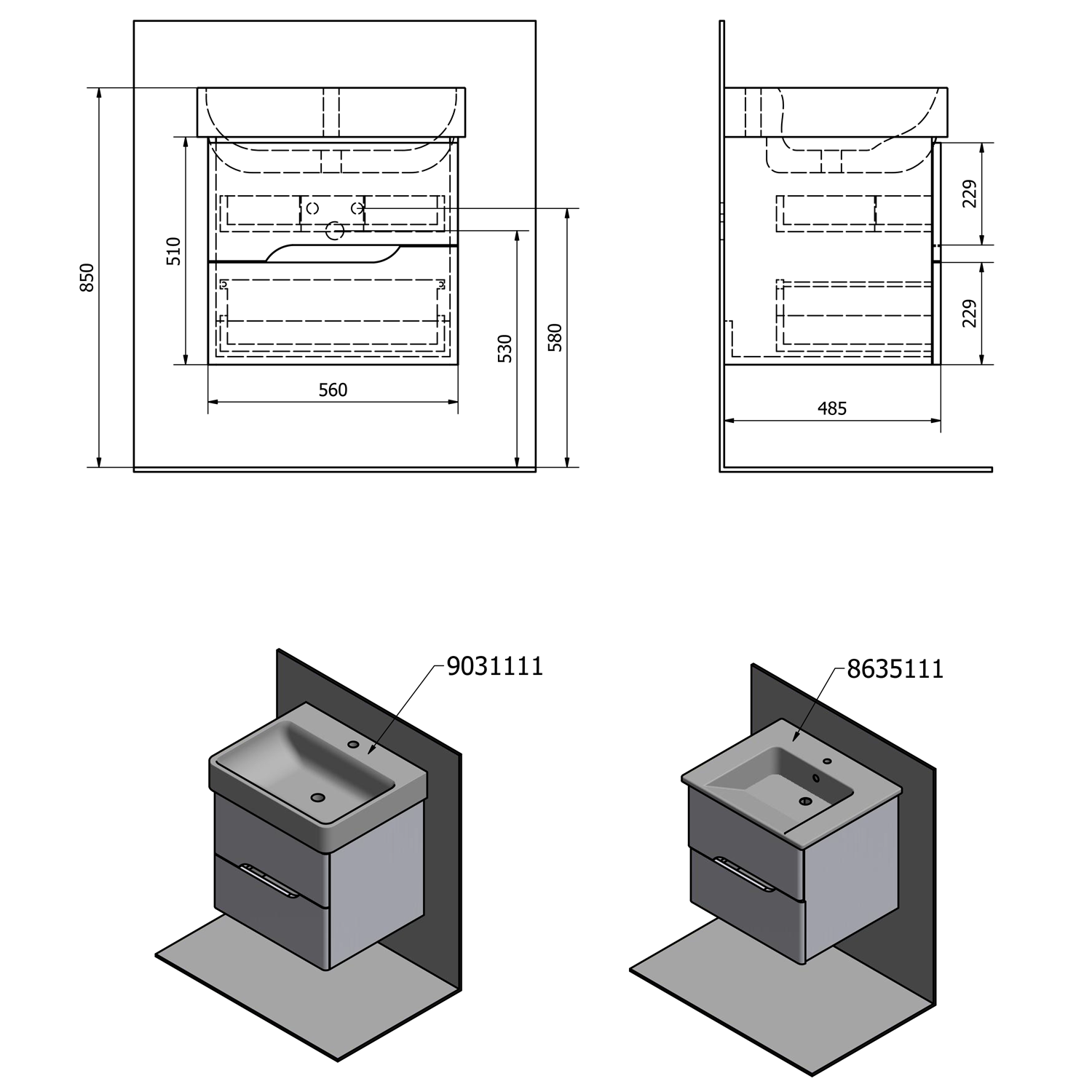 MEDIENA mosdótartó szekrény, 2 fiókkal, 57x50,7x48,5cm, matt fehér/grafit tölgy (MD061)