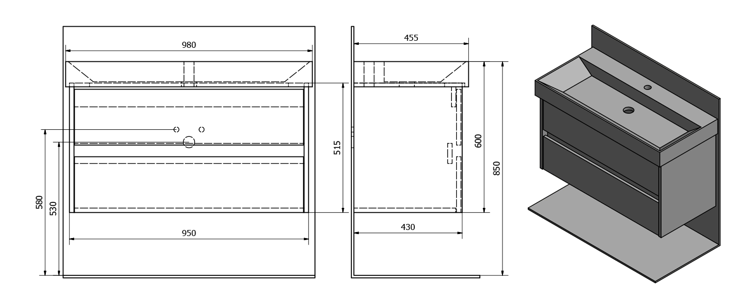 AR473 QUADRADO betonmosdó lefolyóval, 2 furatos, 96x44cm, szürke gránit