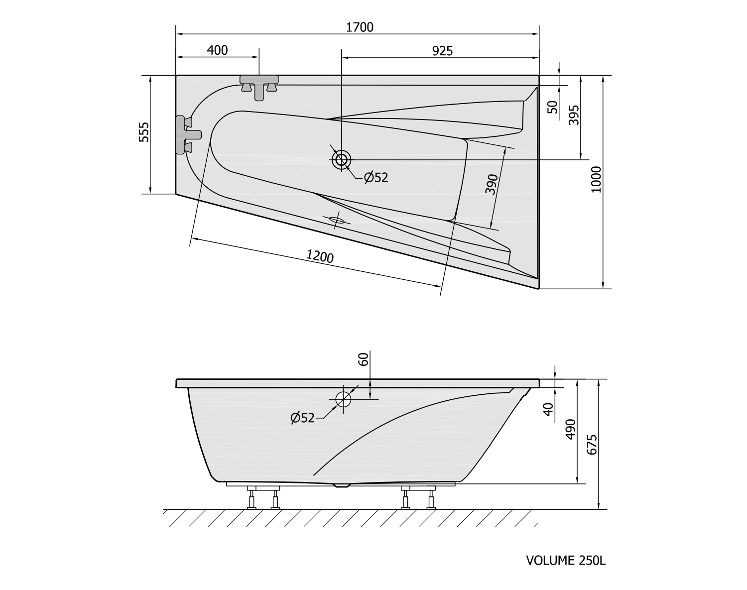 97611 POLYSAN TANDEM aszimmetrikus kád, jobbos, 170x130x50cm