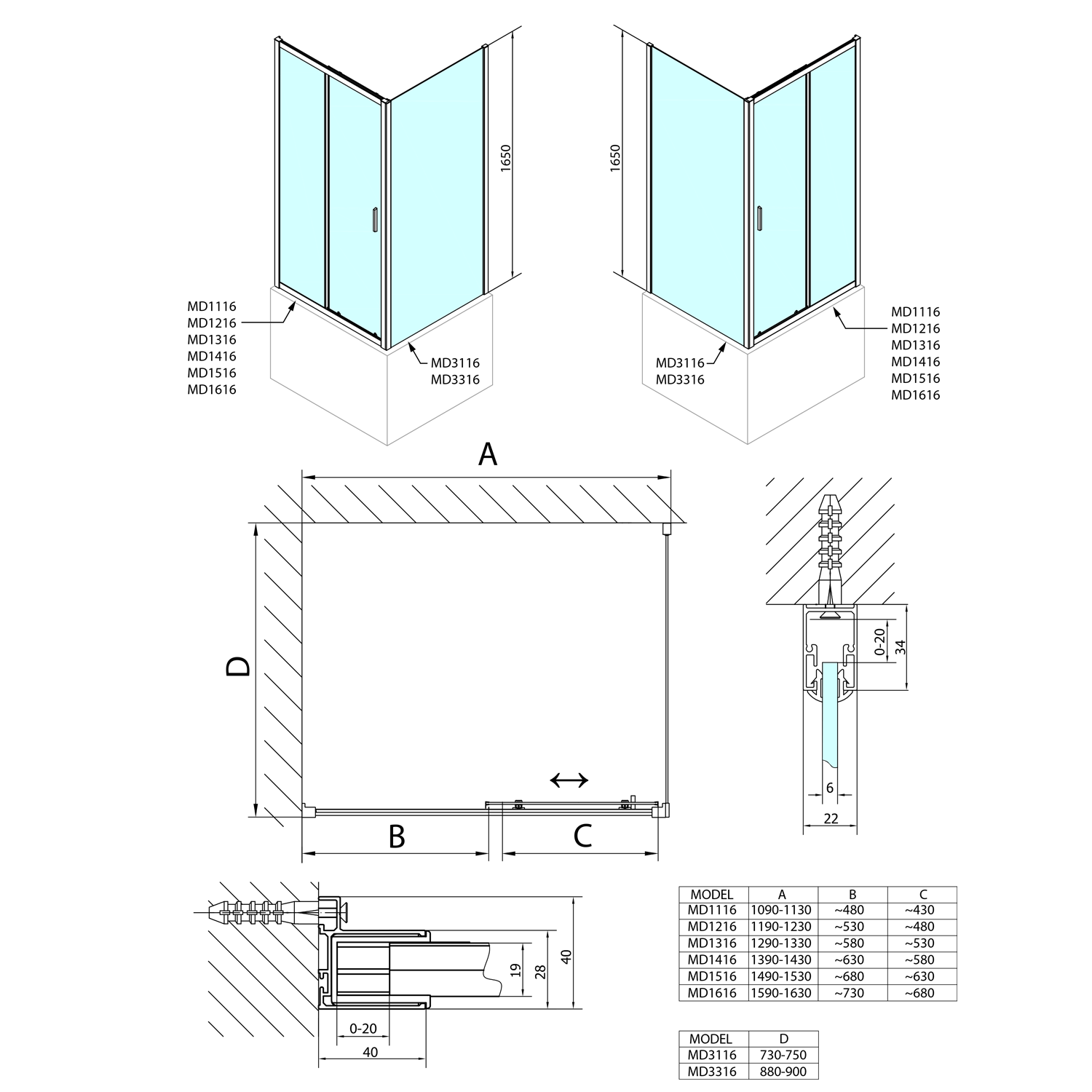 MD1616MD3116 DEEP szögletes zuhanykabin 1600x750mm, balos/jobbos,transparent