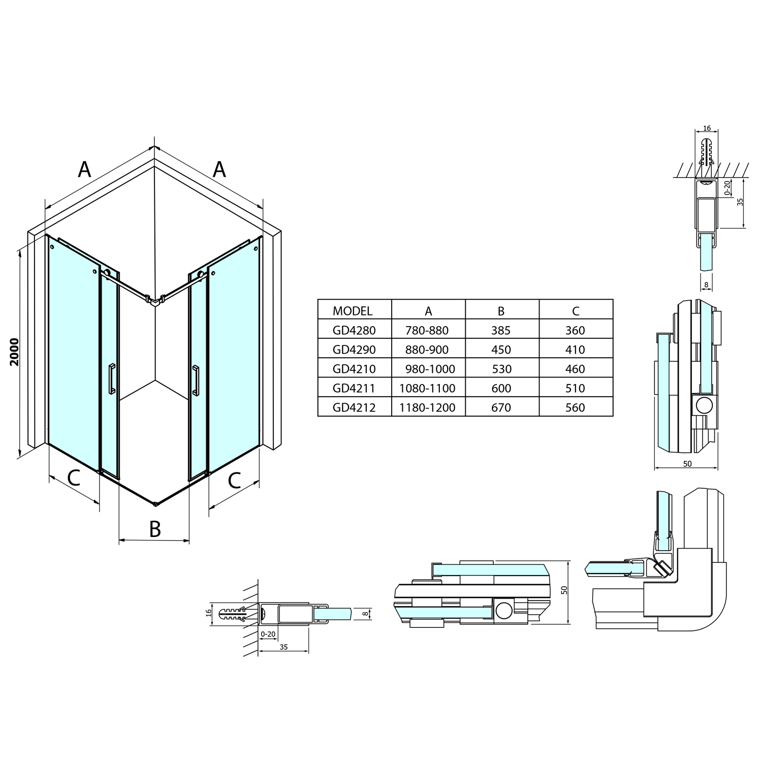 GD4211GD4212 DRAGON szögletes zuhanykabin 1100x1200mm, balos/jobbos, sarokbelépős
