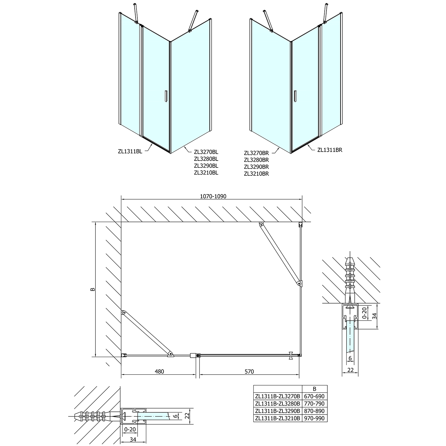 ZL1311BZL3210B POLYSAN ZOOM LINE zuhanyajtó és oldalfal, jobbos/balos, 1100x1000mm, transzparent, fekete