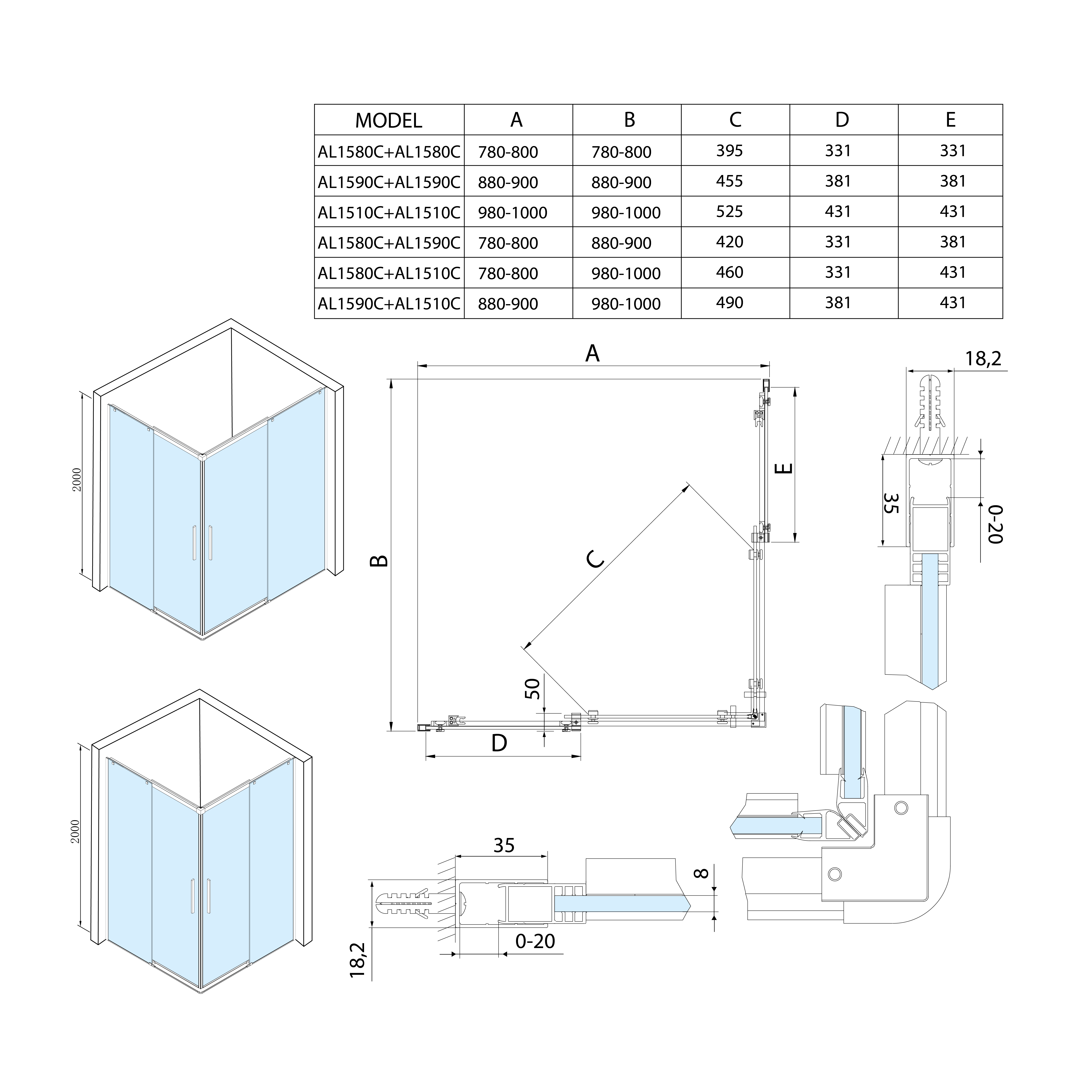 AL1510CAL1580C ALTIS LINE szögletes zuhanykabin, 1000x800mm, jobbos/balos, sarokbelépős