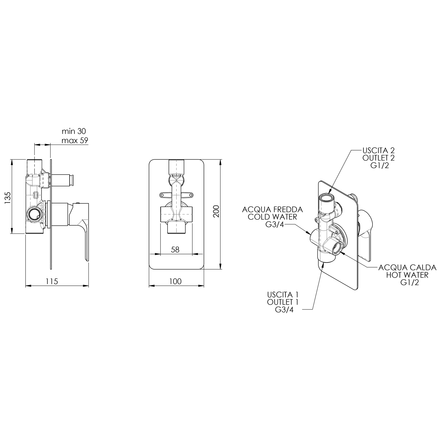 XA53 PAX falbasüllyesztett csaptelep, 3-irányú, zuhanyszettel, króm