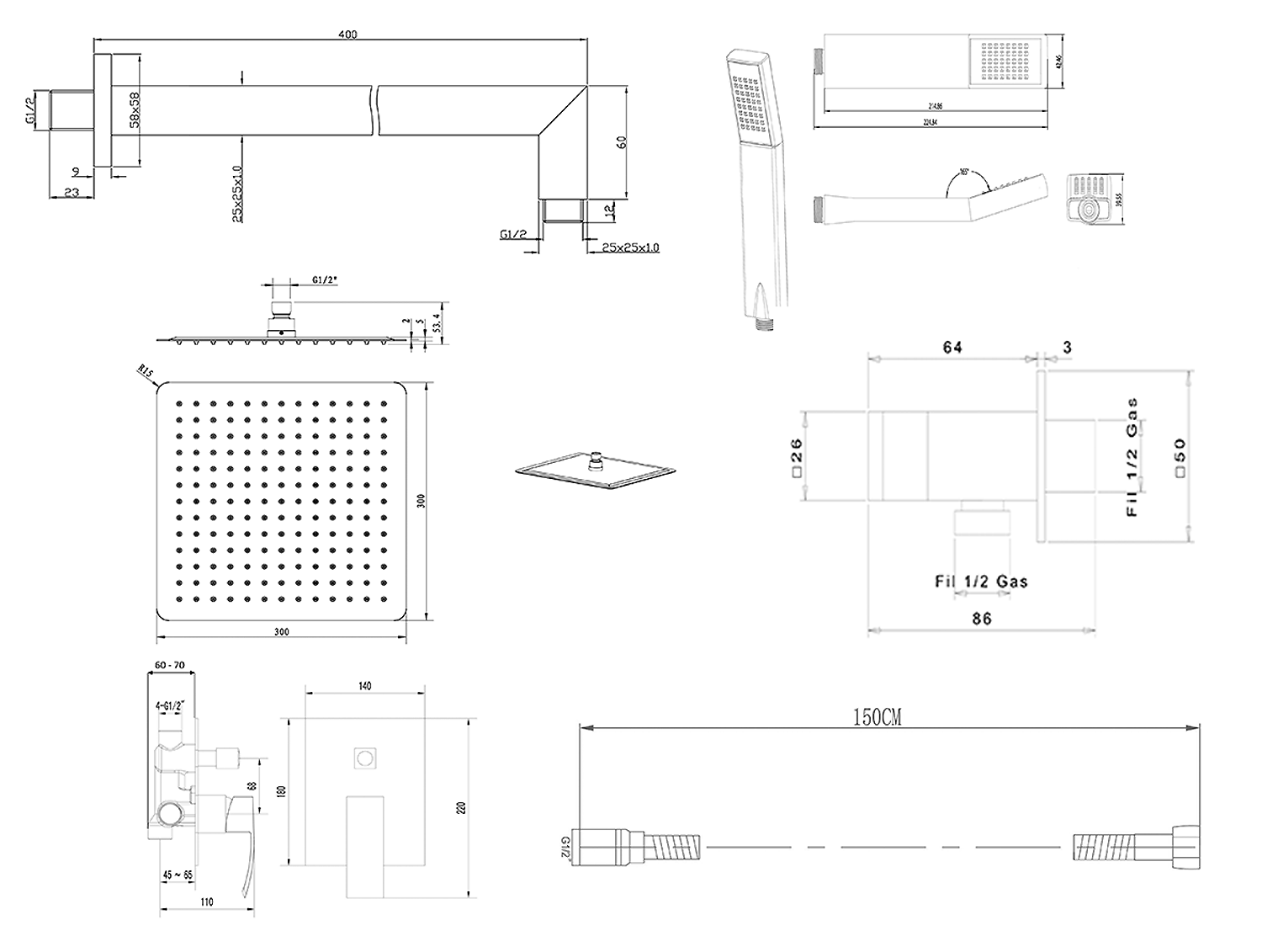 MS563 SLIM fejzuhany, szögletes, 300x300mm, inox (1db)
