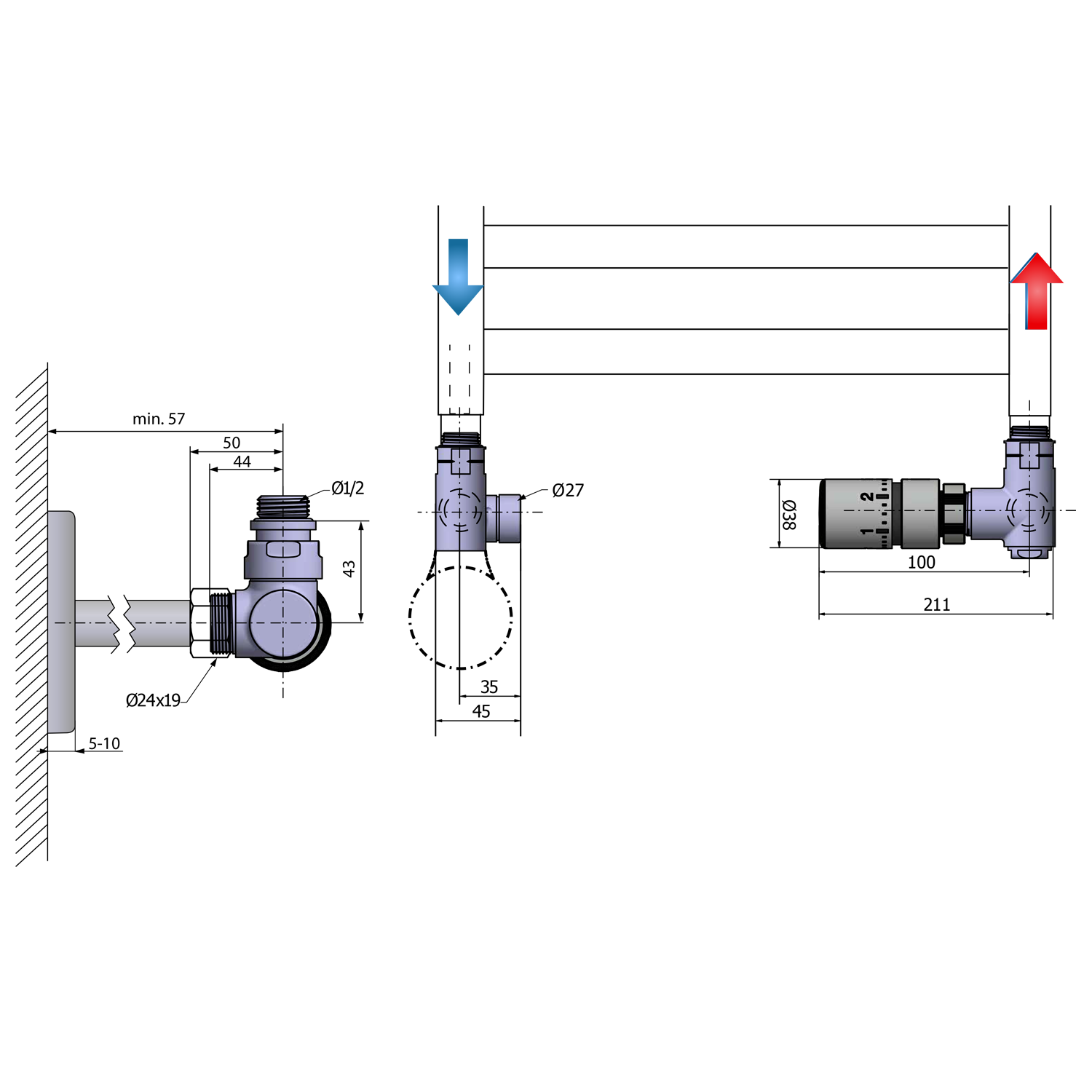 Including universal pipes adaptor for Cu (O15 mm) and Alupex (O16x2 mm). No need to order anything else to connect the heating radiator.