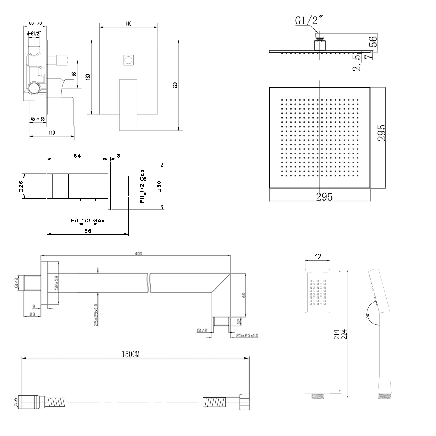 1203-06 fejzuhany, szögletes, 30x30cm, króm (1db)