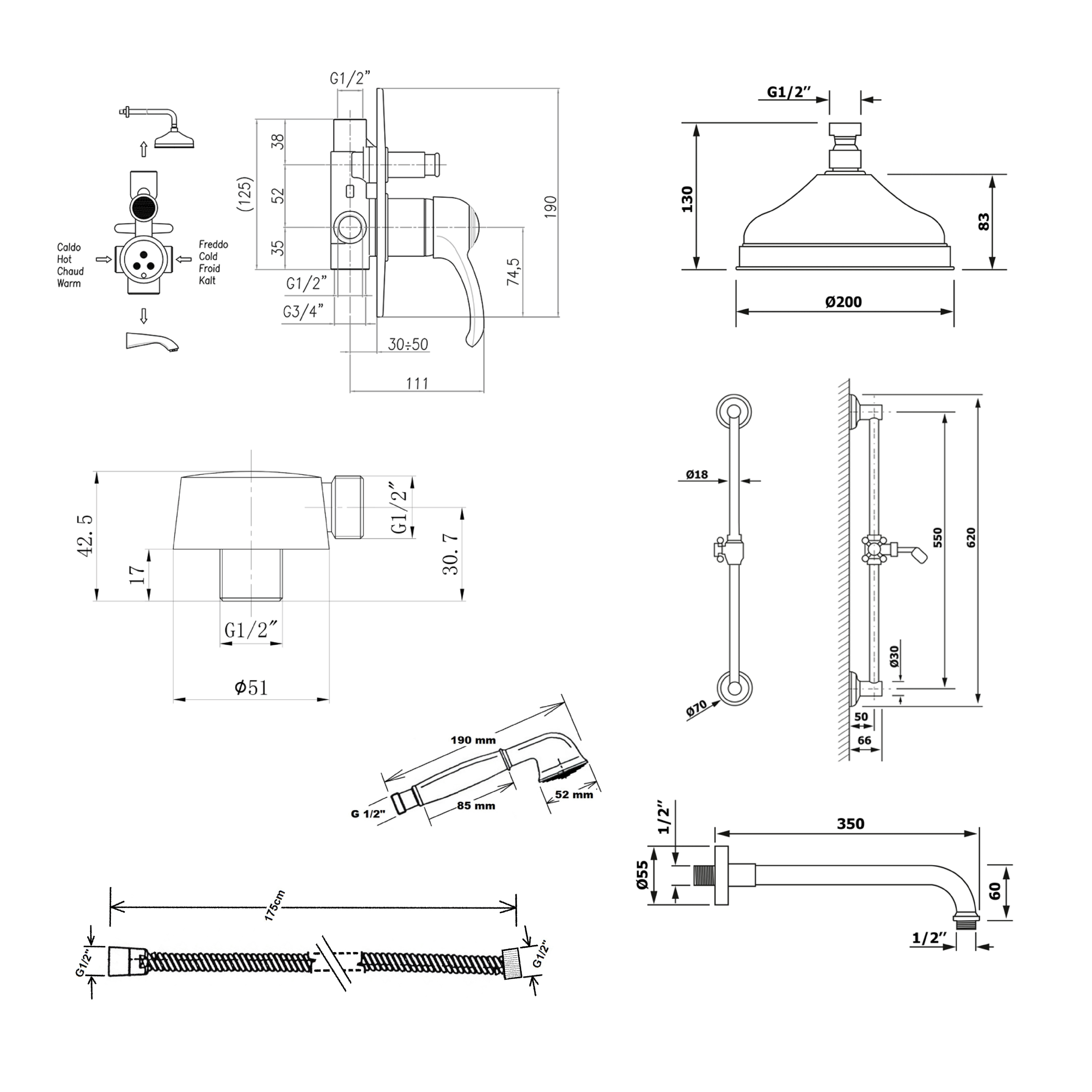 KI42B-01 KIRKÉ falba süllyesztett csaptelep, 2-irányú váltóval, zunayszettel, fejzuhannyal, bronz