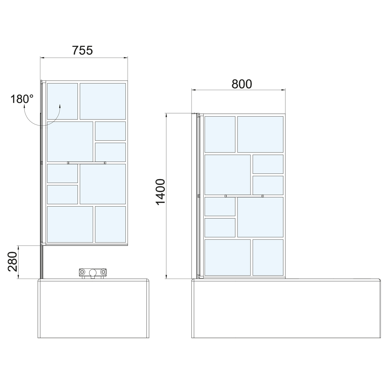 Integrated pneumatic pistons allow the screen to be raised by 28cm and tilted to the wall, e.g. over the bathtub mixer. This solution offers easy maintenance and access in the bathtub. Thanks to the pressure piston, protection against splashing water is ensured.