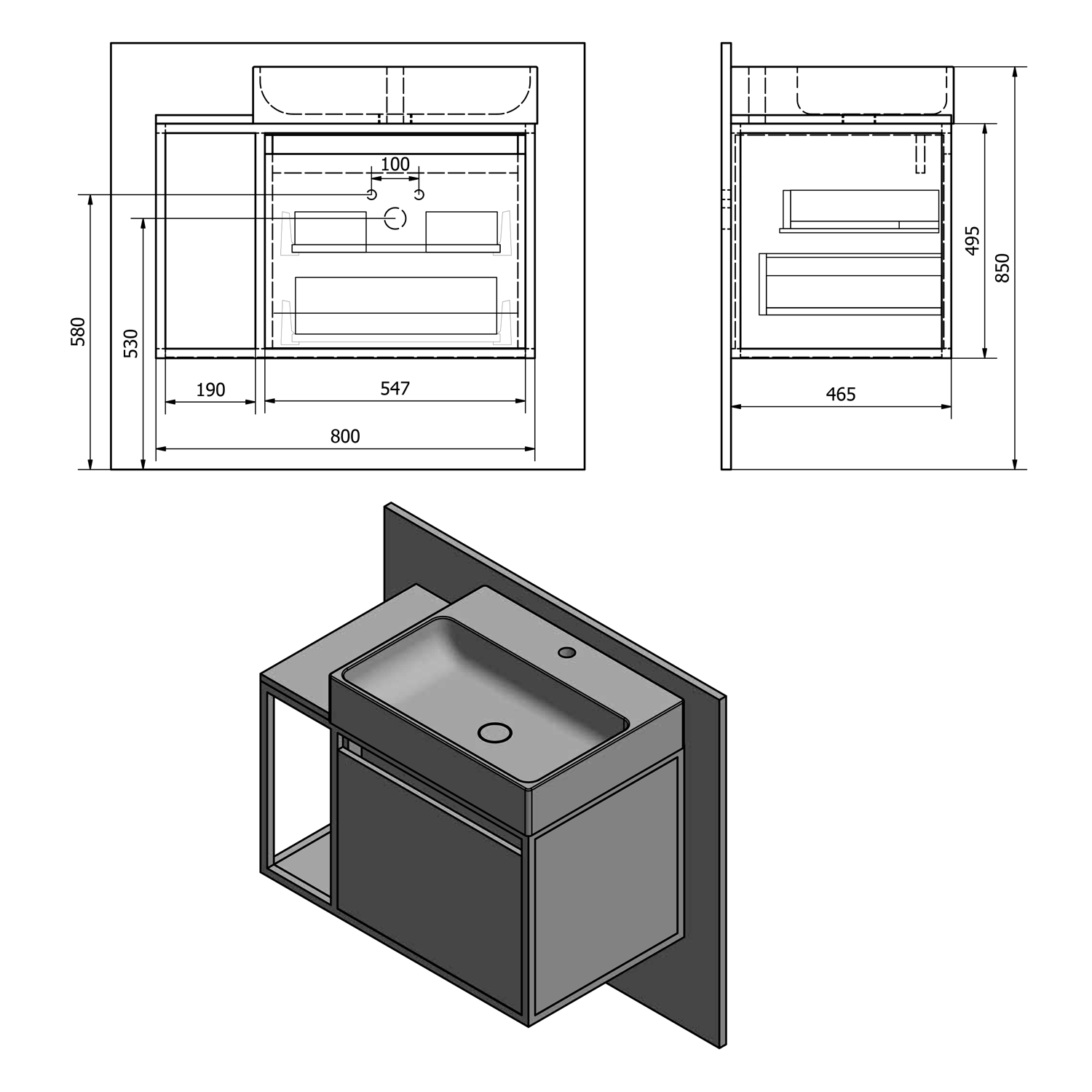 CG004-3131 SKARA fali mosdótartó szekrény, matt fekete kerettel, 100x46,5cm, matt fehér