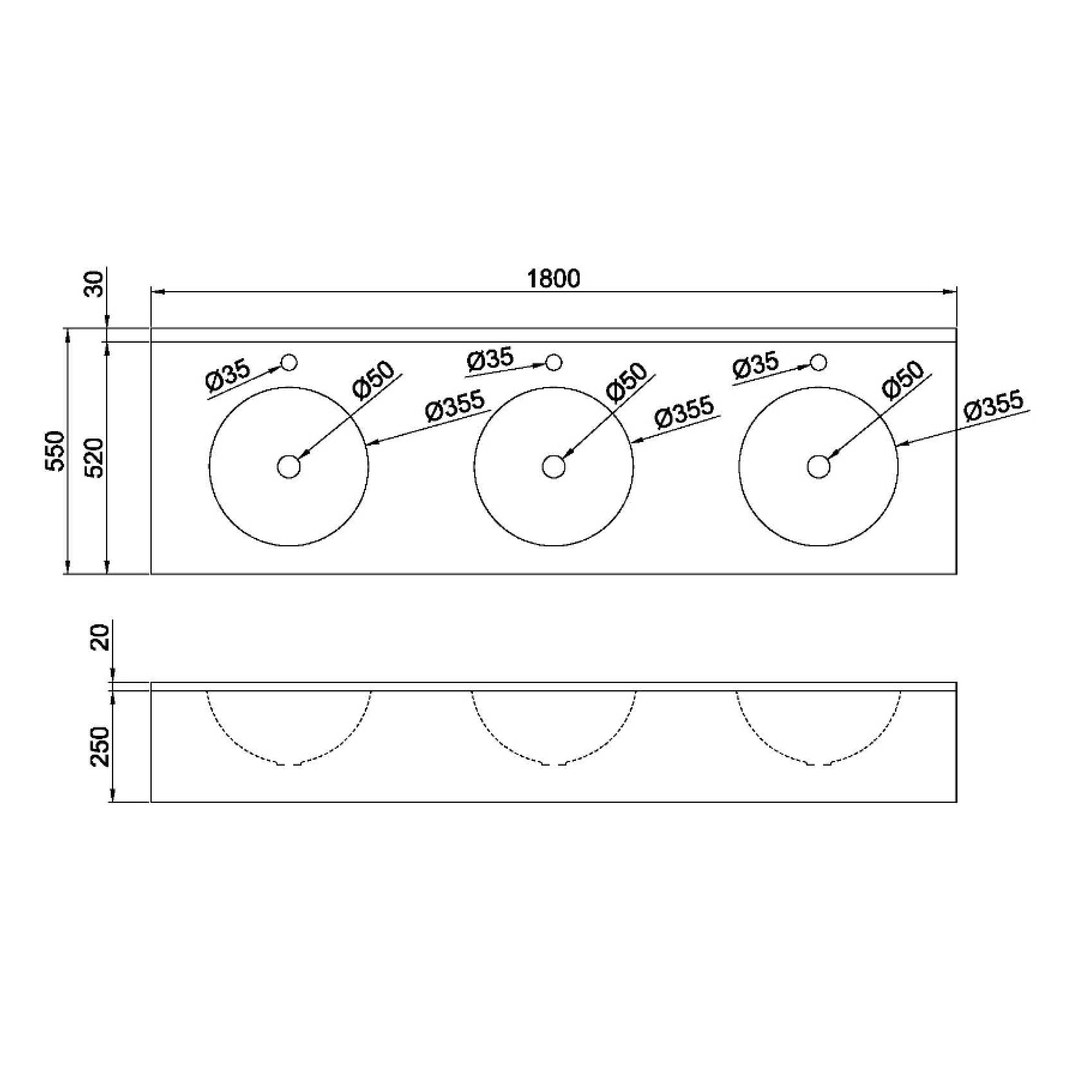 NOFER pult három süllyesztett mosdóval, 1800x270x550mm, matt rozsdamentes acél (13080.3.S)