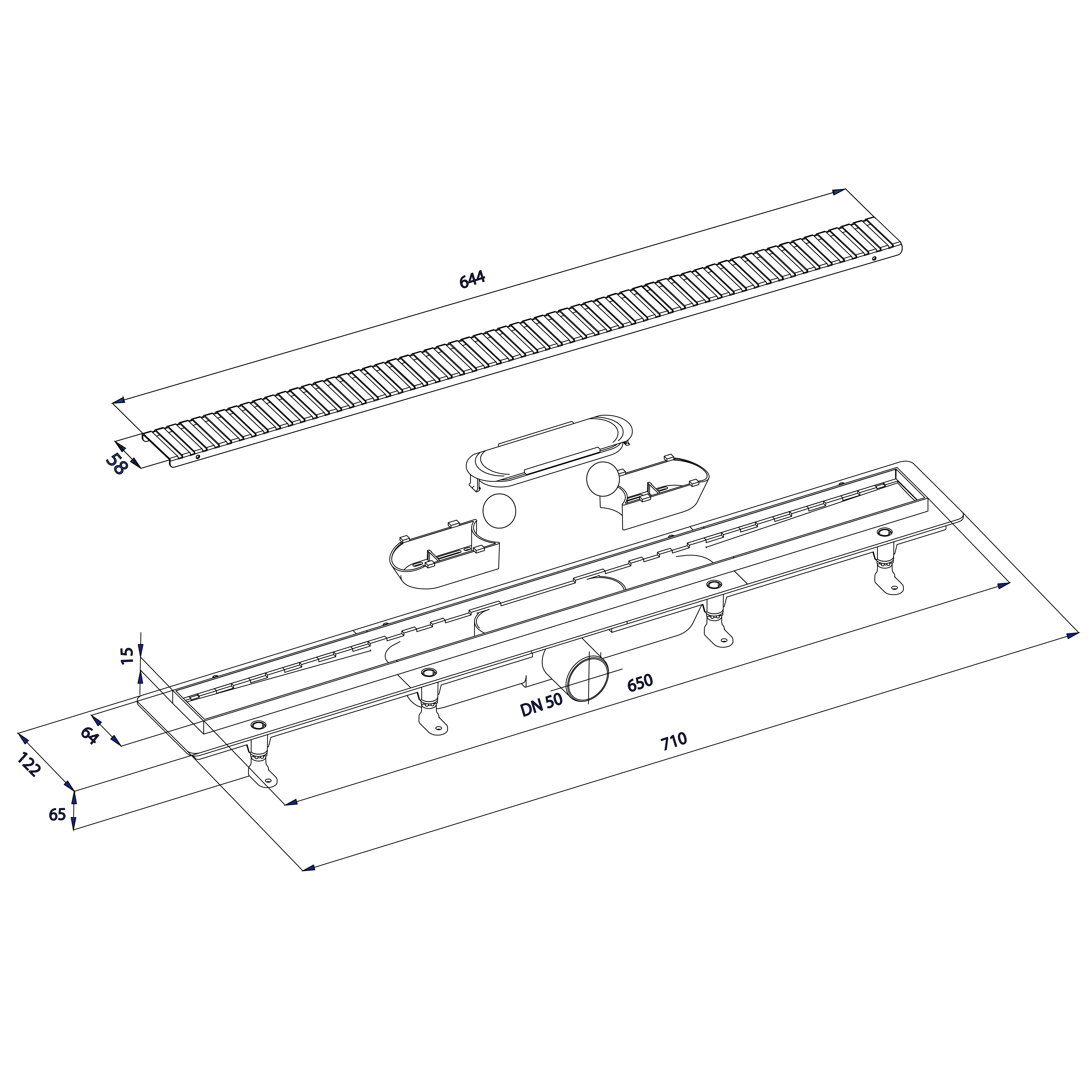 BRUCKNER padlóösszefolyó, inox ráccsal, DN50, 710x122x65mm (700.157.2)