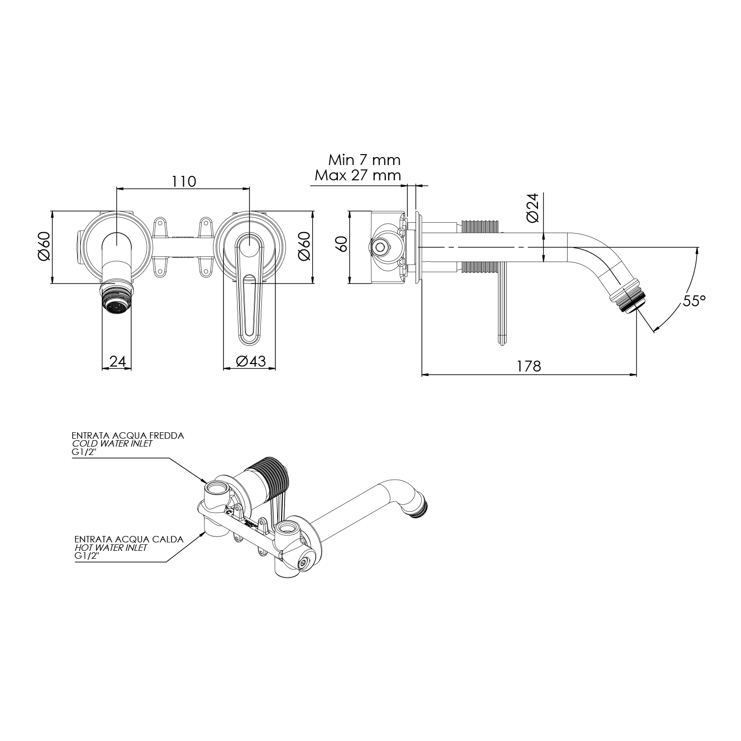 BB042 BEBÉ falsík alatti csaptelep, 2 irányú, króm