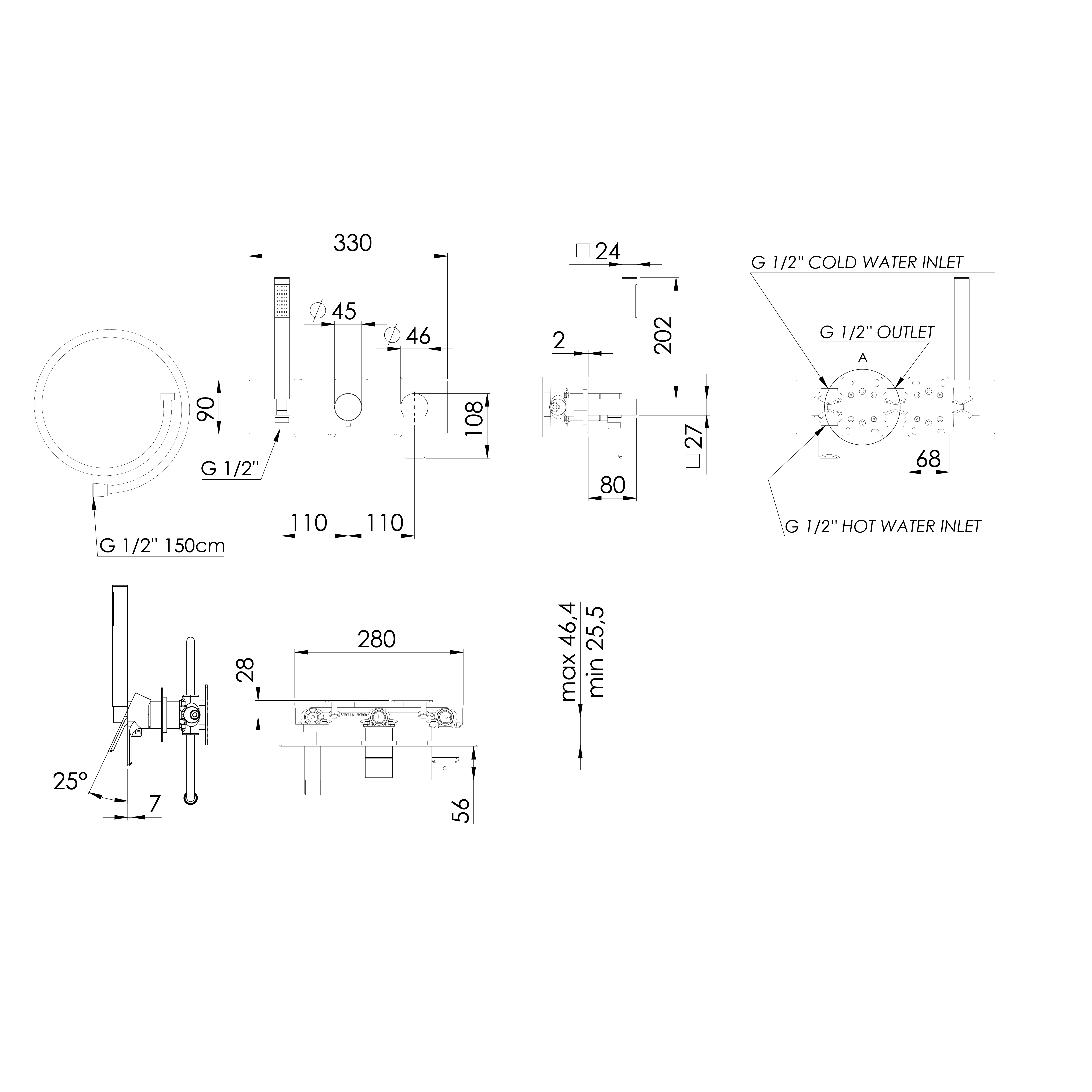 PAX falbasüllyesztett csaptelep, 2-irányú, zuhanyszettel, króm (XA52)