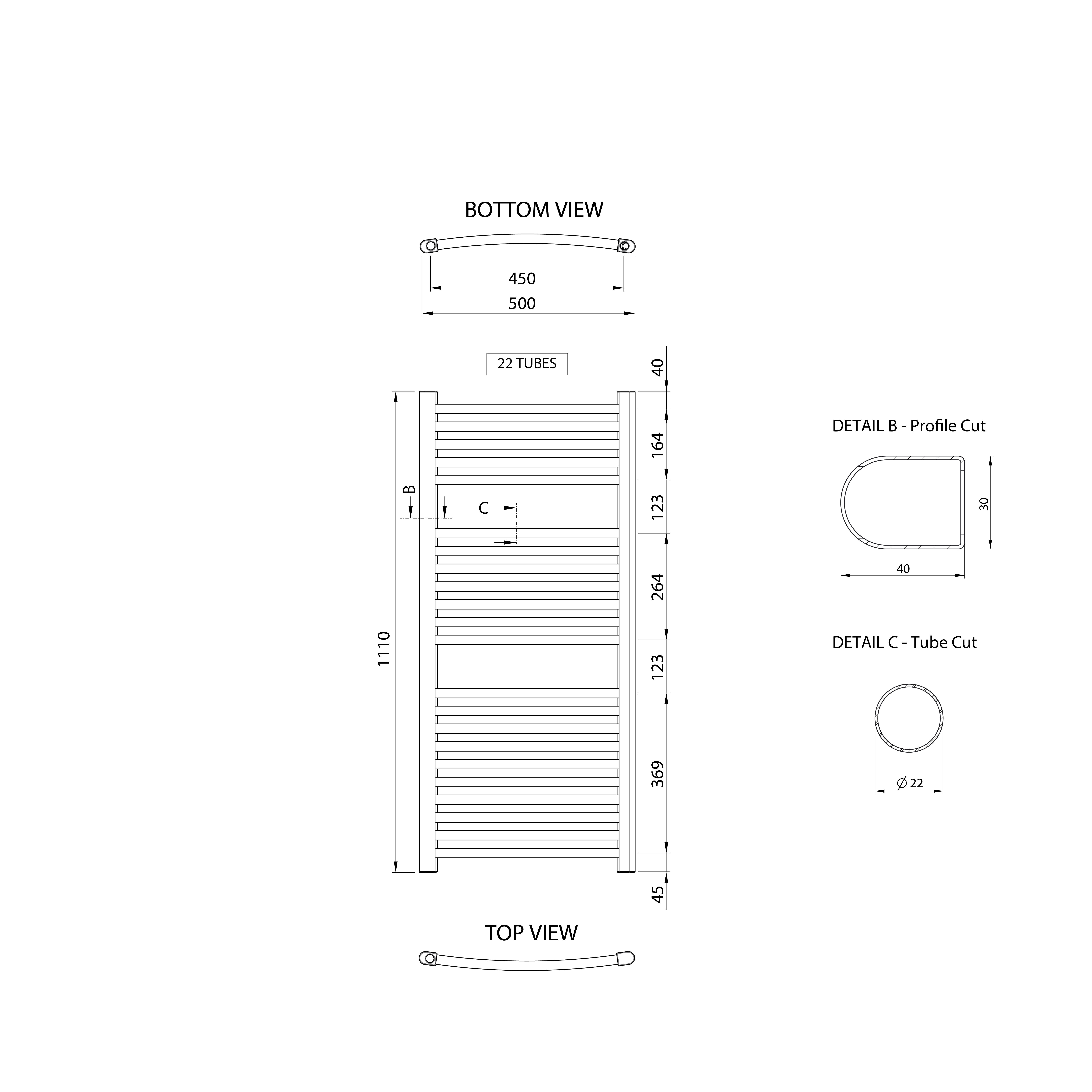 1110-05 ALYA íves fürdőszobai radiátor, 500x1118mm, 305W, króm