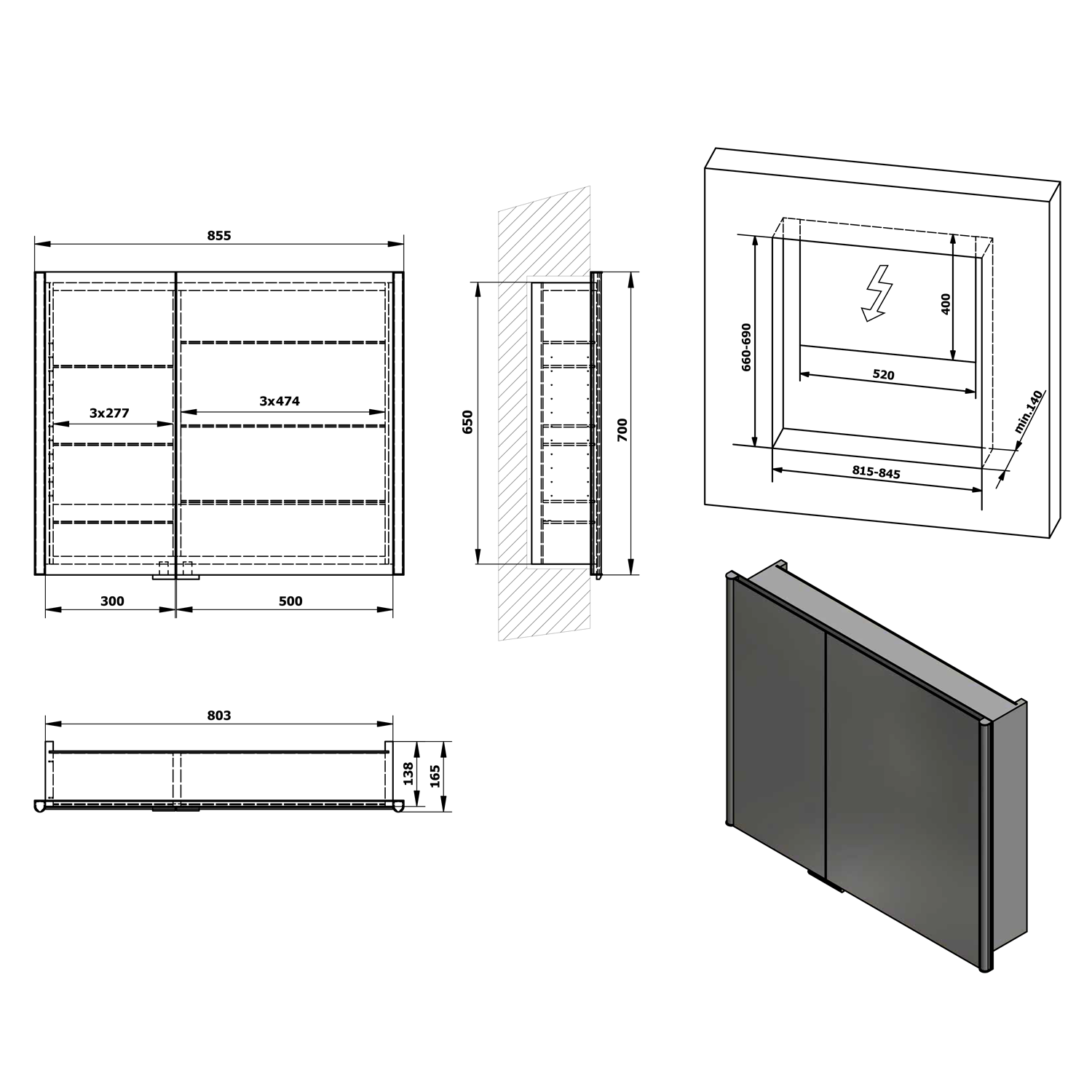IN085 INTEGRA falsík alatti tükrösszekrény LED világítással, 85,5x70x16,5cm (1db)