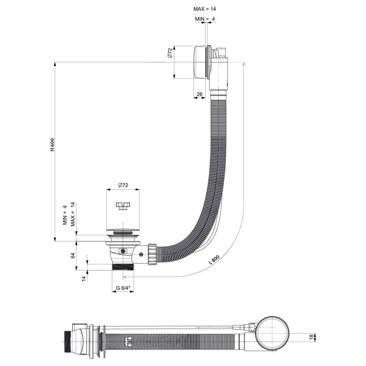 POLYSAN kád le- és túlfolyó, bovdenes, 800mm, átm.:72mm, matt fekete (71852.21)