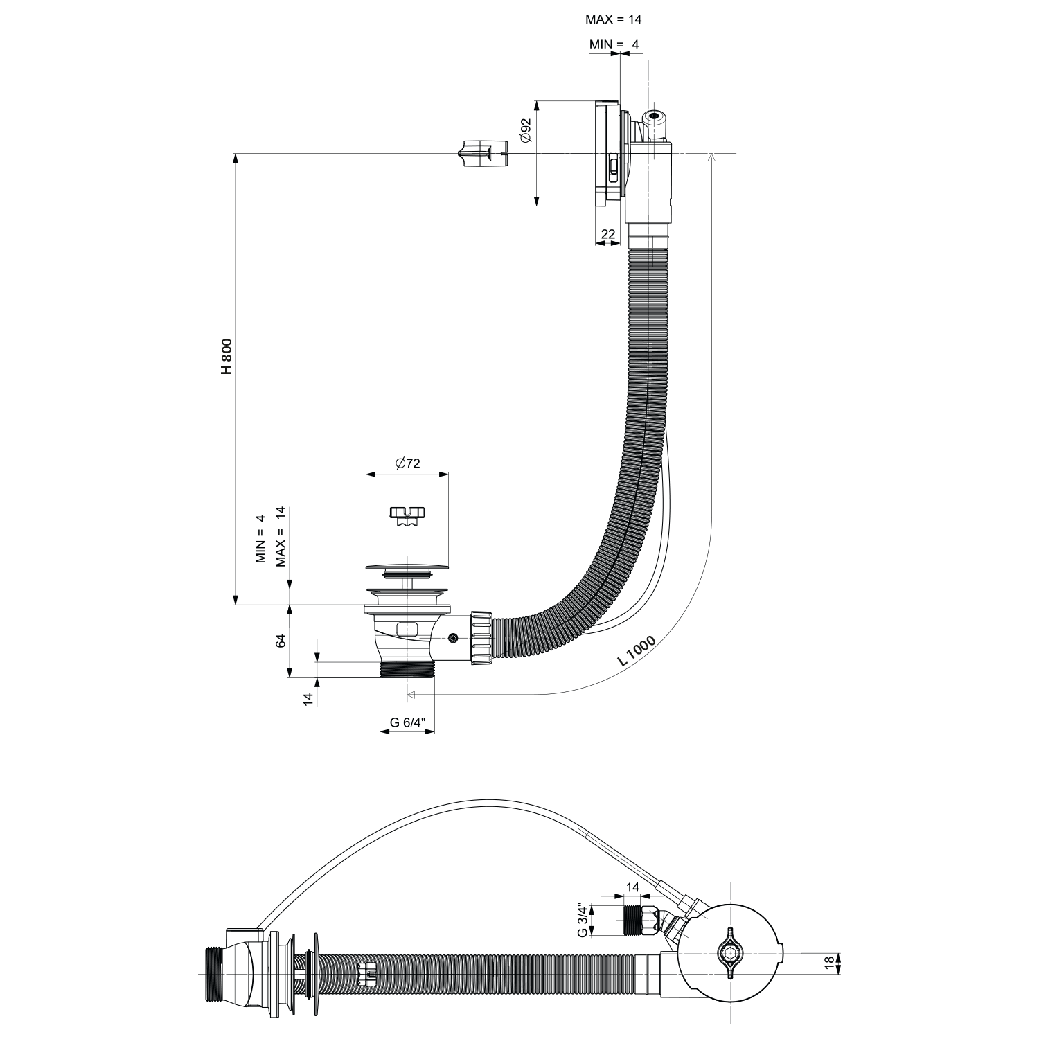 POLYSAN kád le- és túlfolyó, kádtöltővel, bovdenes, 1000mm, átm.:72mm, króm (71855)