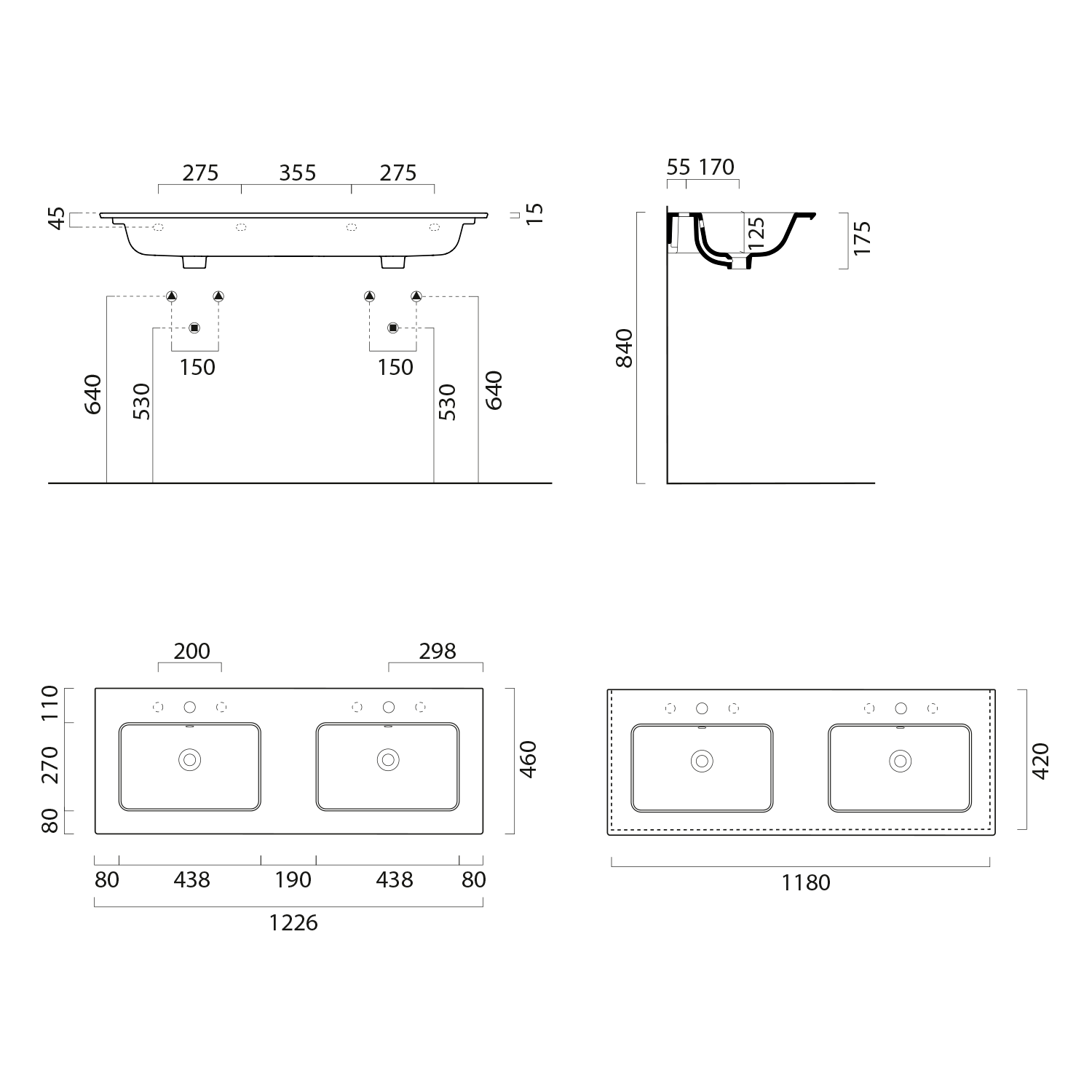 8888026 GSI PURA SLIM dupla kerámiamosdó, 122,6x46cm, furat nélkül, matt fekete