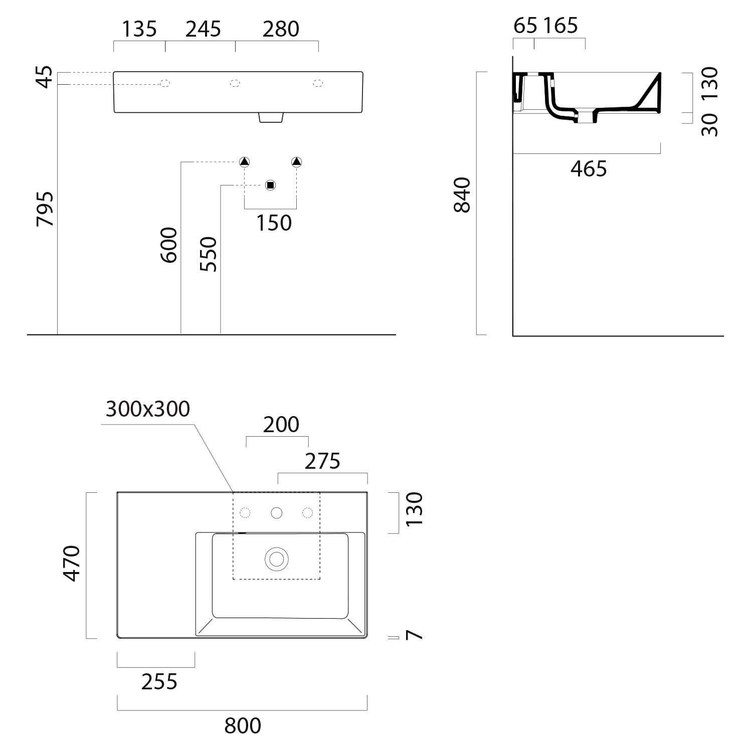 94579311 GSI KUBE X kerámiamosdó, 80x47cm, csiszolt alsó élekkel, 3 furattal, ExtraGlaze
