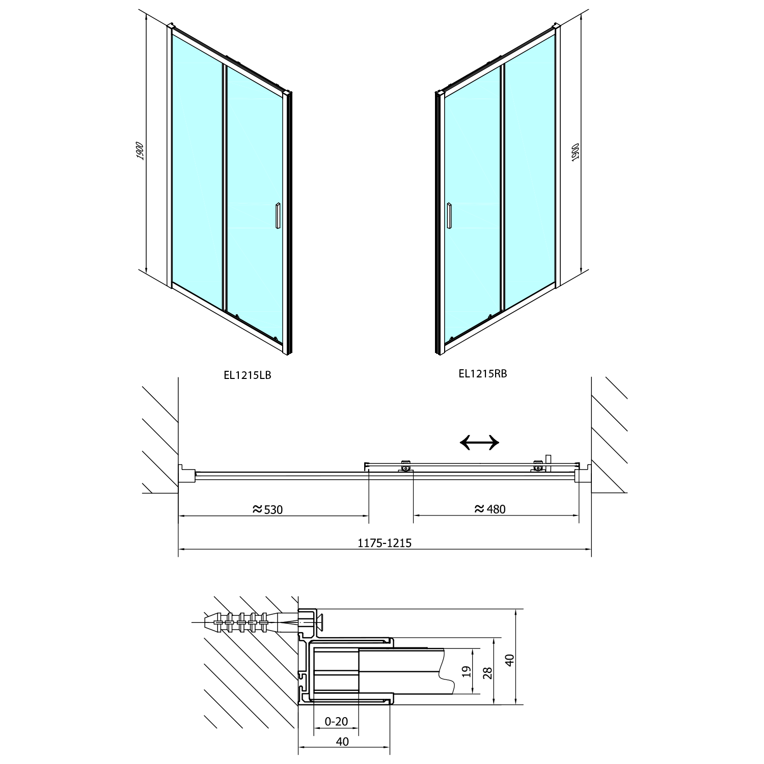 EL1215B-01 EASY BLACK zuhanyajtó oldalfallal, 1200x700mm, jobbos/balos
