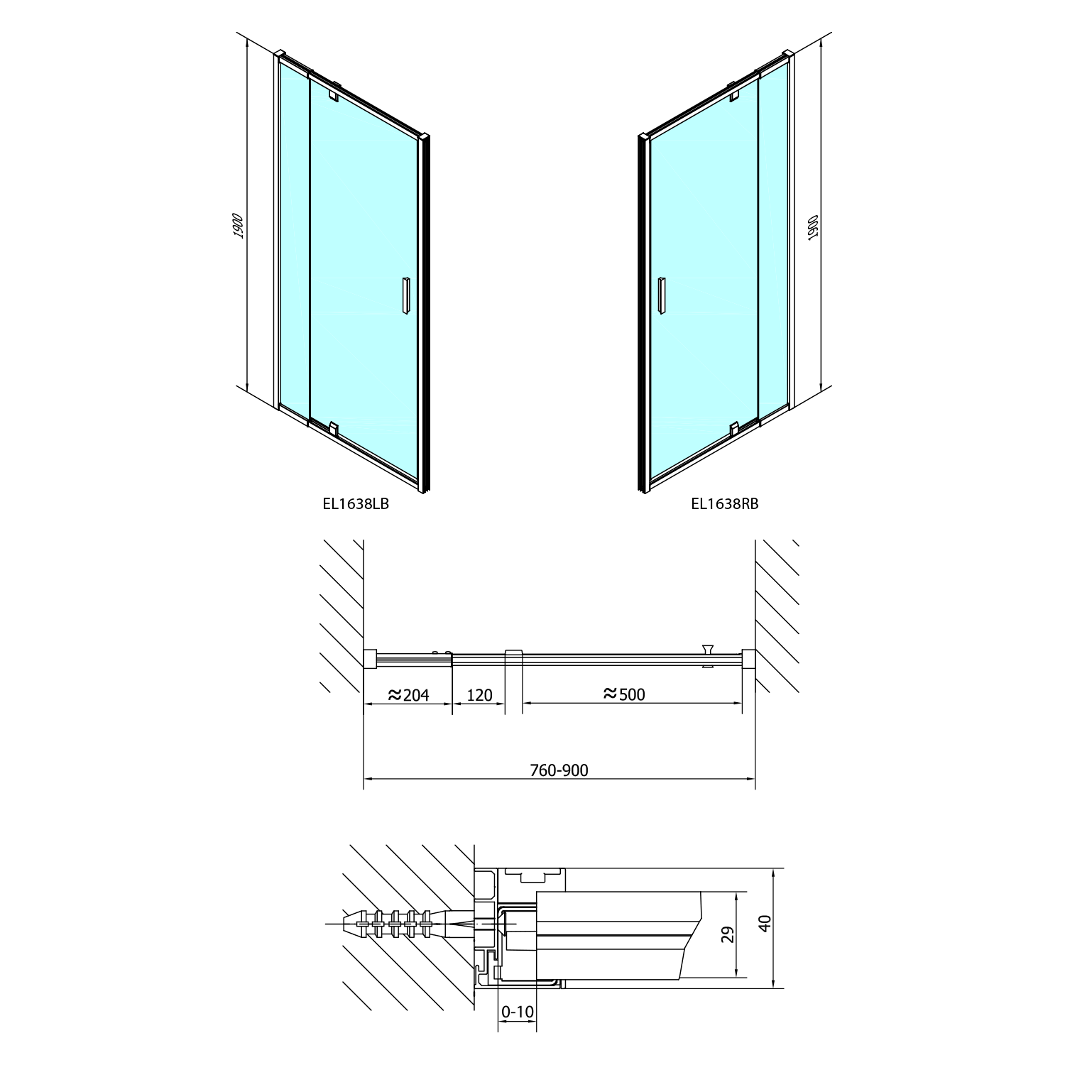 EL1638B POLYSAN EASY LINE BLACK nyílóajtó fix résszel, 760-900mm, matt fekete profil/BRICK üveg