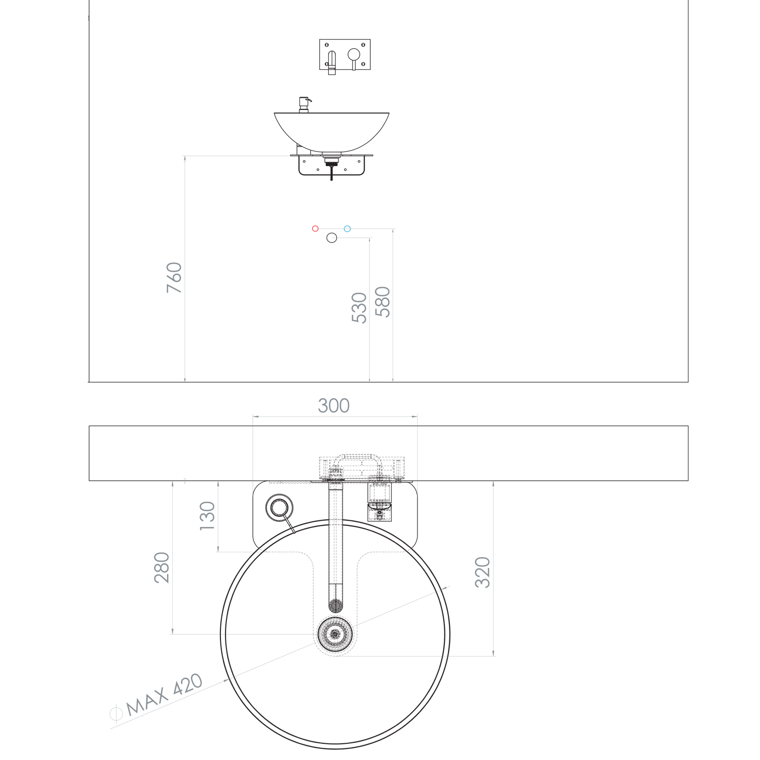TZ429-01 TETRIS mosdótartó konzol, kerámiamosdóval, alátéttel, falbasüllyesztett csaptelephez