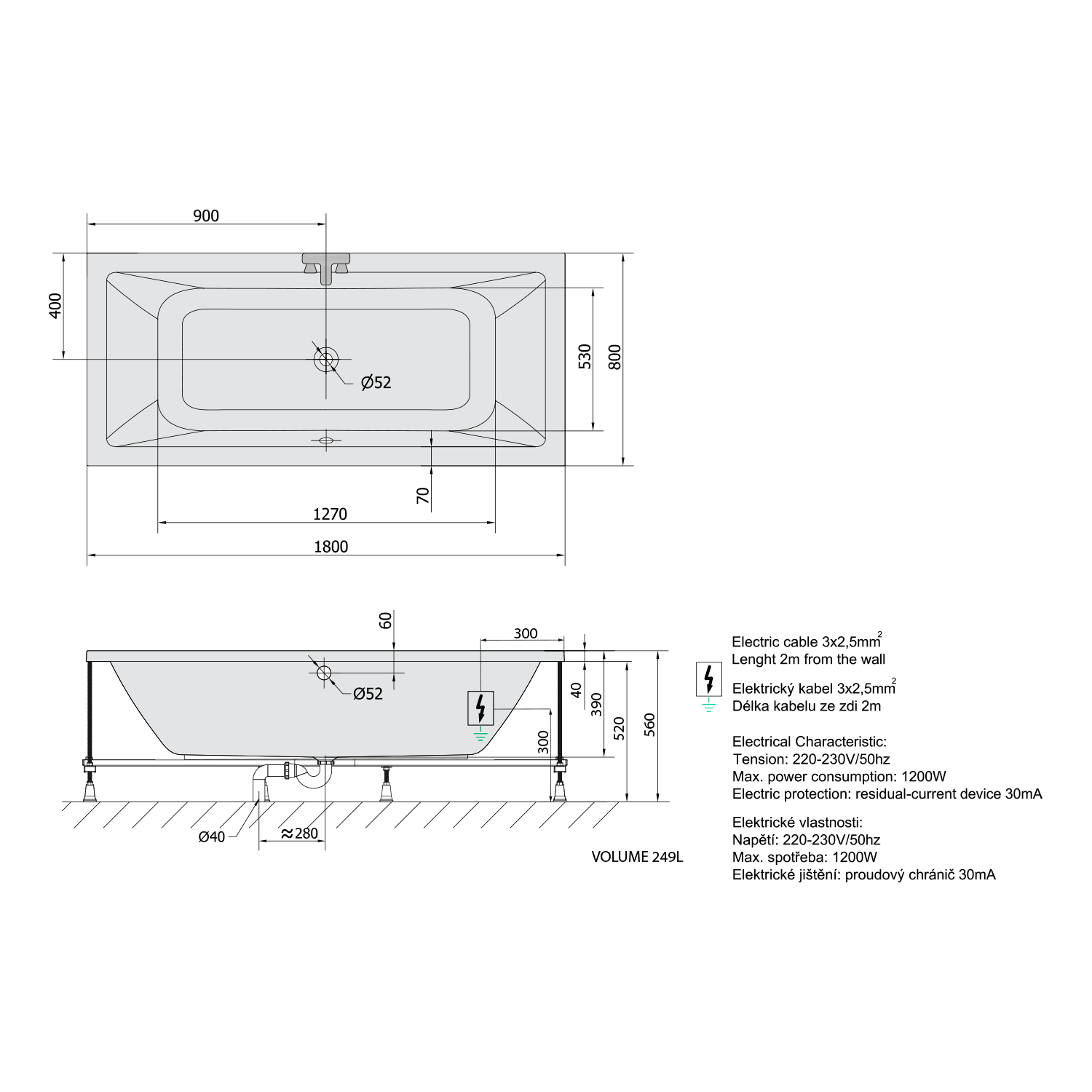 95611.5010 POLYSAN CLEO kád, Highline Hydro, 180x80x48cm, króm